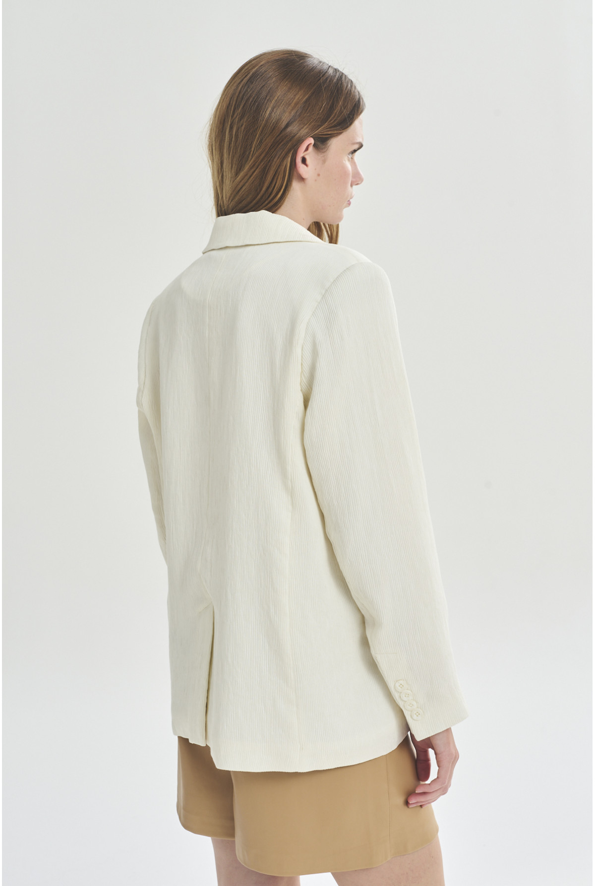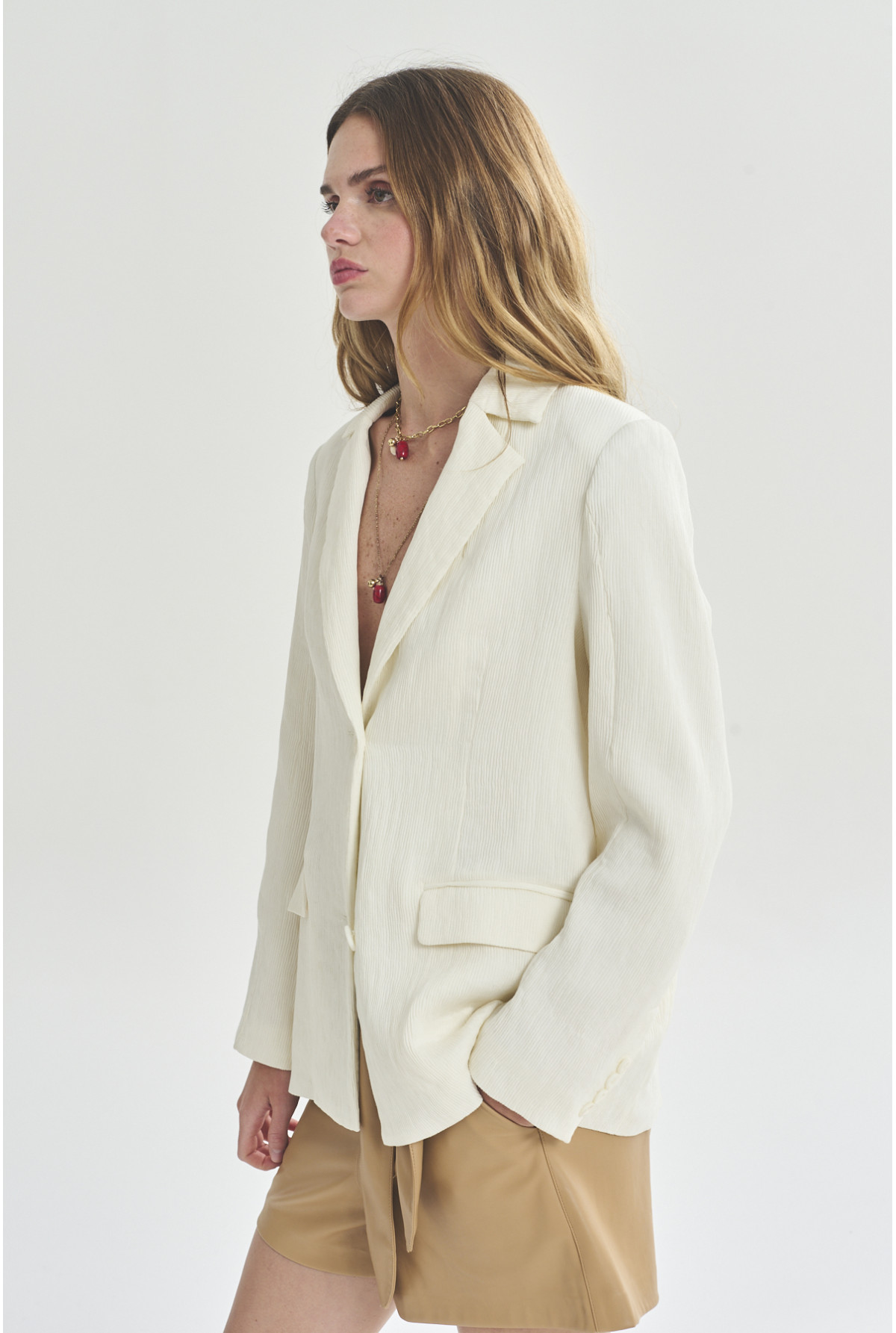 Blazer con hombreras .Dos bolsillos delanteros con tapita. Pinzas delanteras de entalle. Forreria al tono.