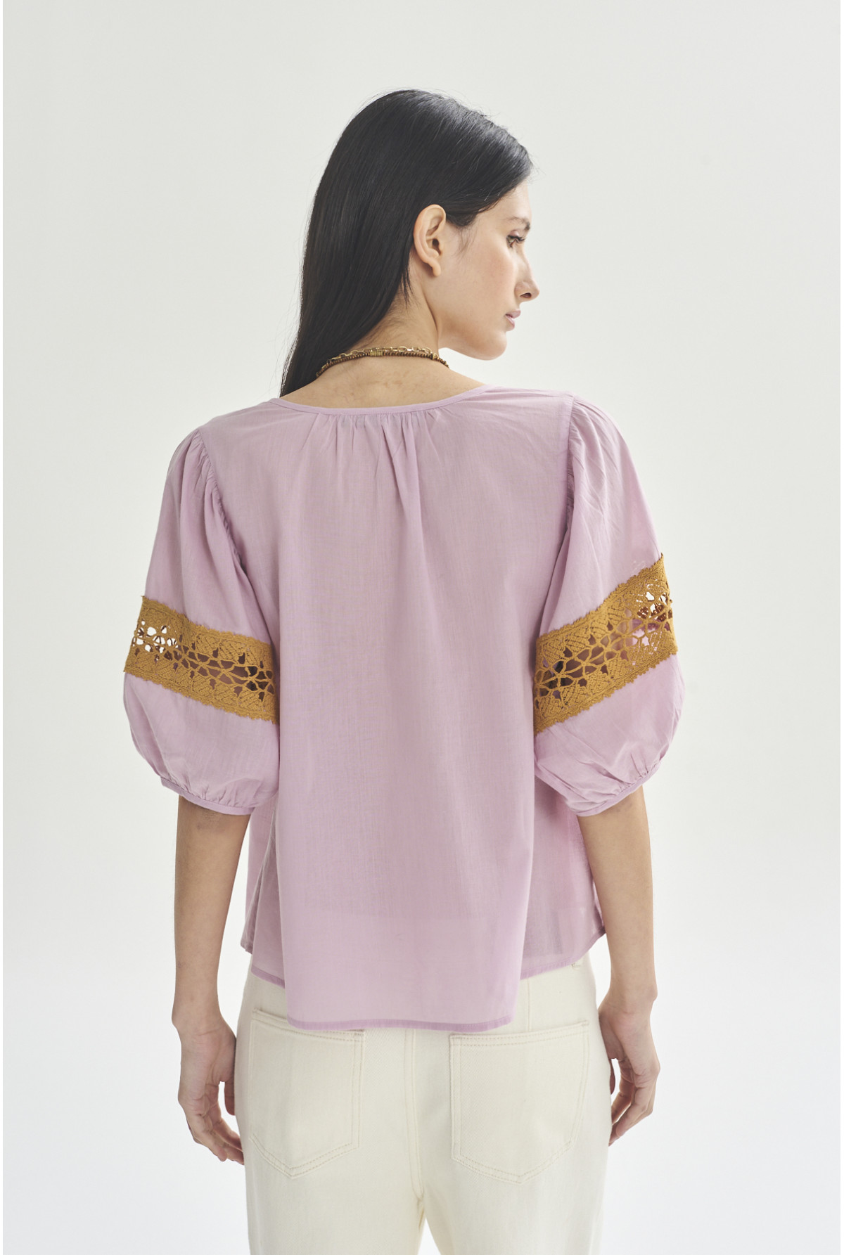 Blusa con mangas cortas abuchonadas y detalle de puntilla en mangas. Escote con frunces y abertura.Con lazo trenzado y fleco para atar en escote.