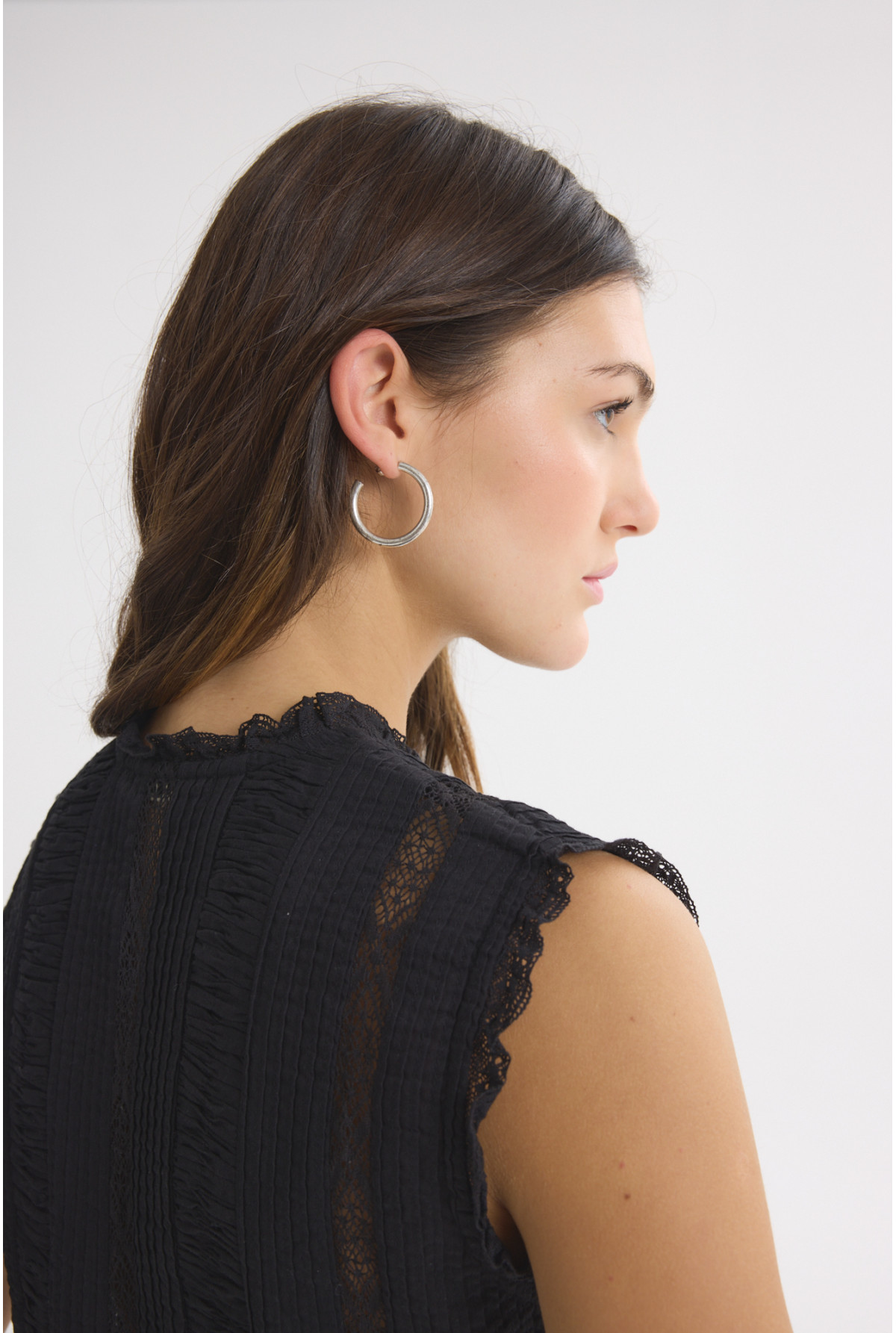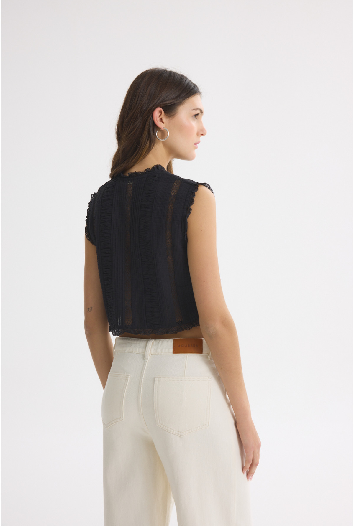 Blusa sin mangas, cartera con botones en delantero. Bordada y puntilla de algodon al tono. Volado de puntilla en sisas y escote.