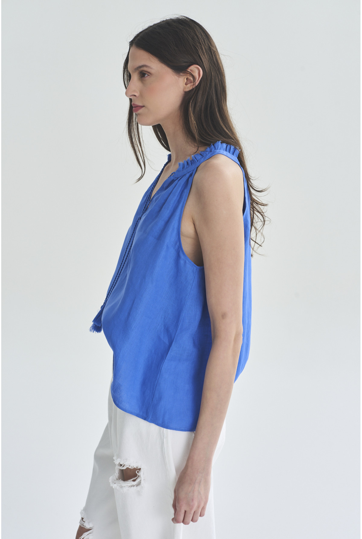 Blusa 100% lino, sin mangas. Flecos en tela base en escote.Tajo en centro escote delantero con tira trenzada y fleco de algodón.