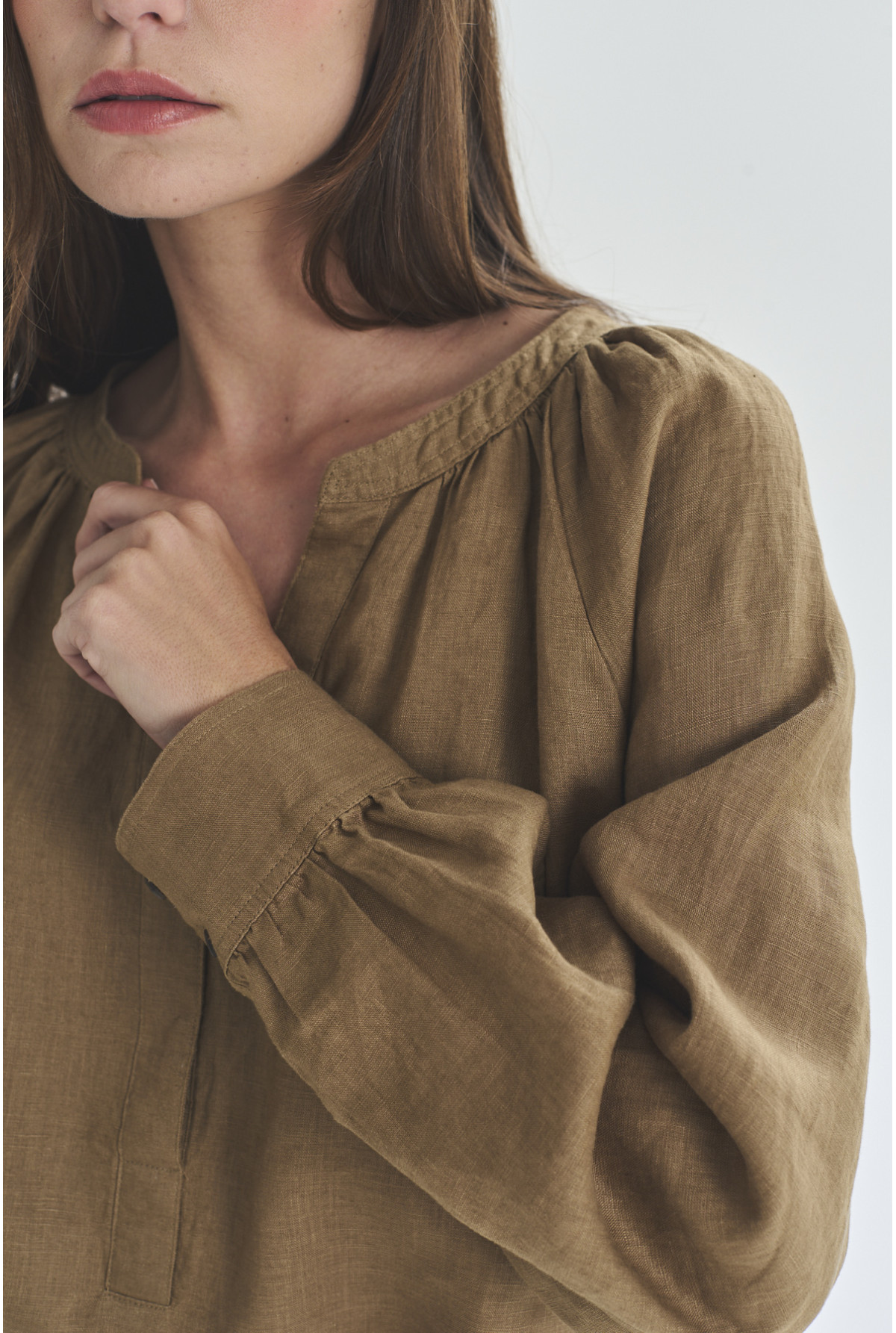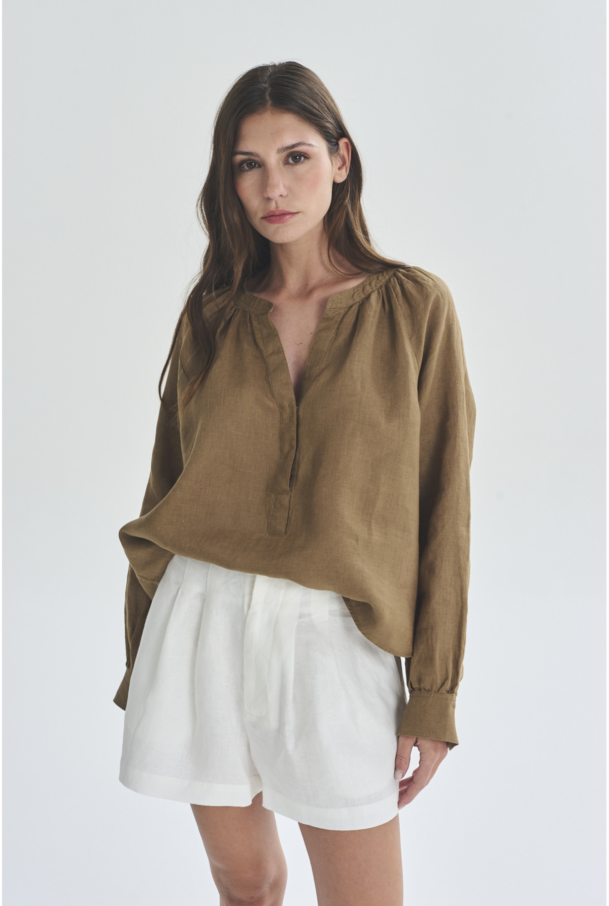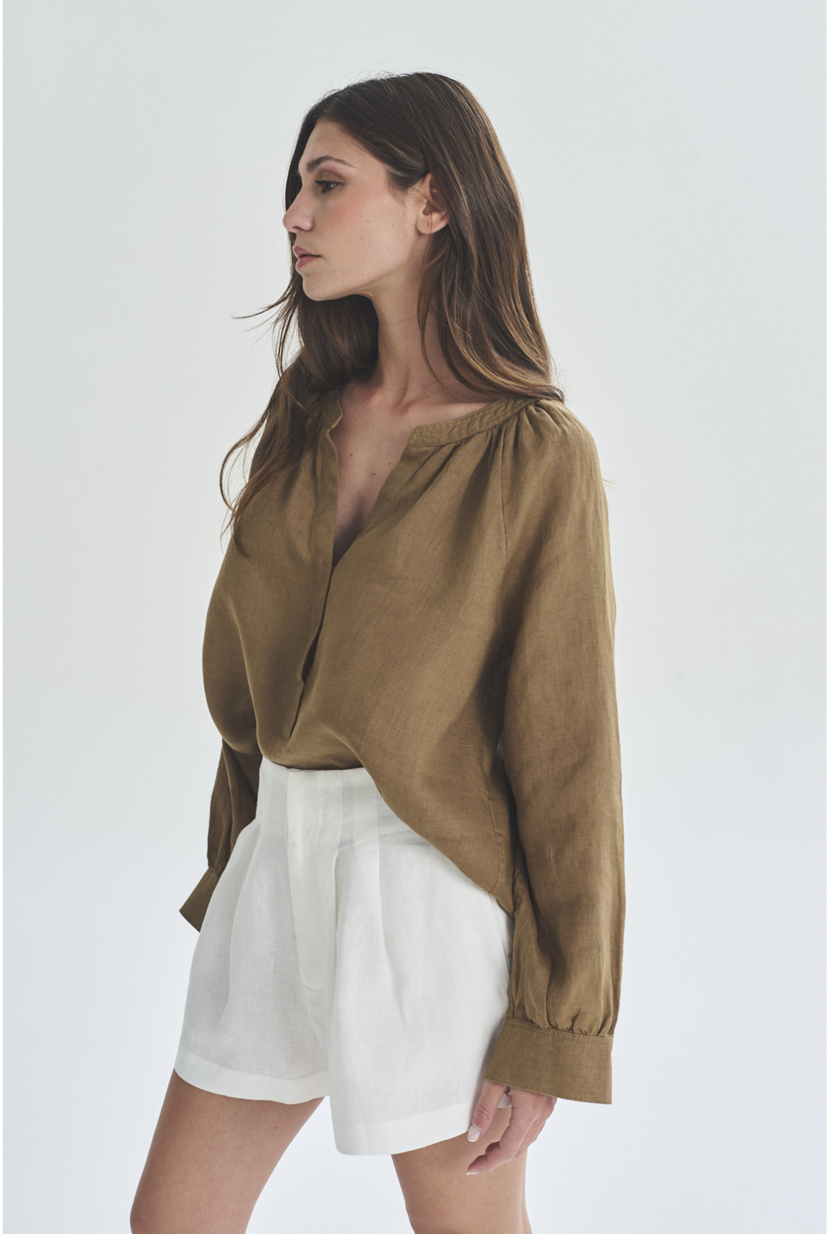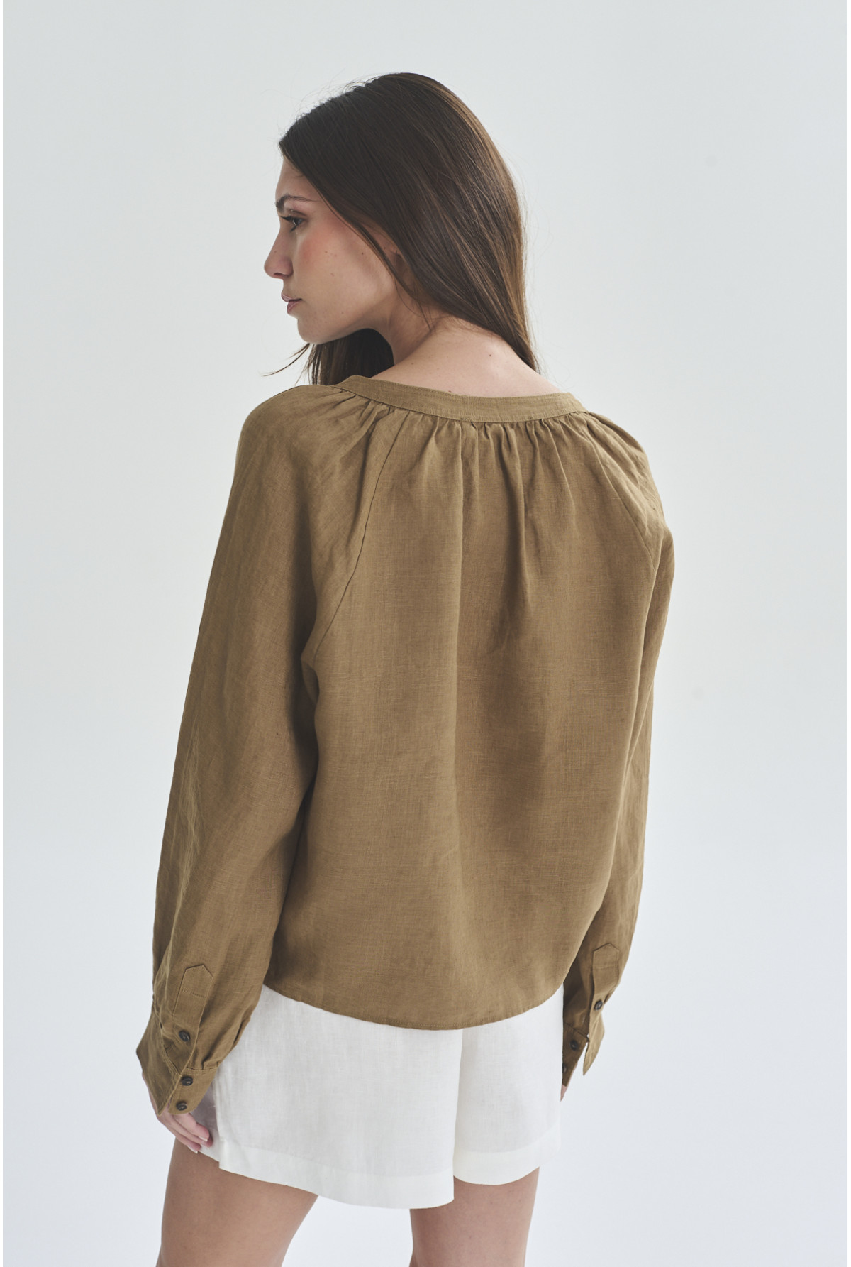 Blusa lino 100%, manga larga, cuello mao.Cartera con broches en delantero