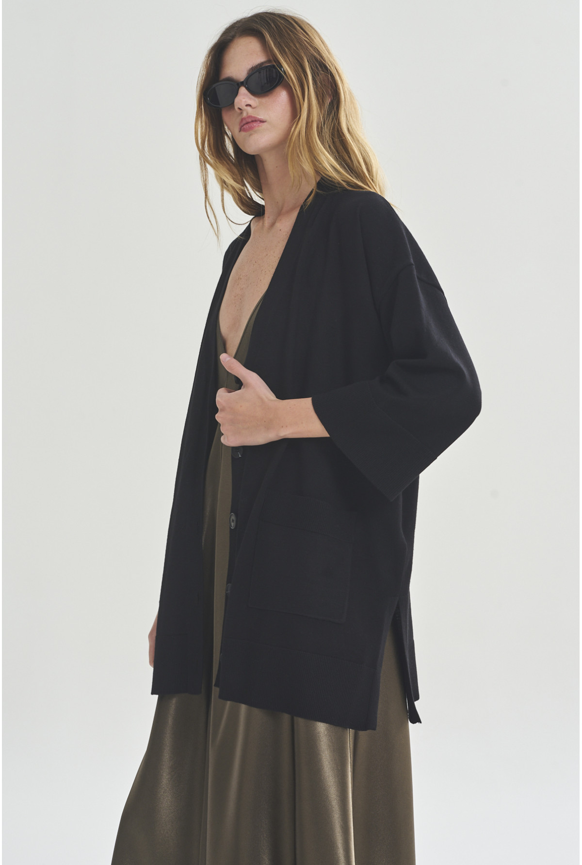Cardigan manga larga, con cuello V. Dos bolsillos delanteros. Calce amplio.