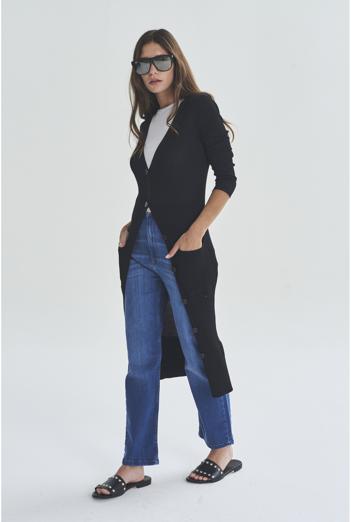 Cardigan largo, manga larga, con cuello V, en Rib. Bolsillos delanteros. Calce fit.