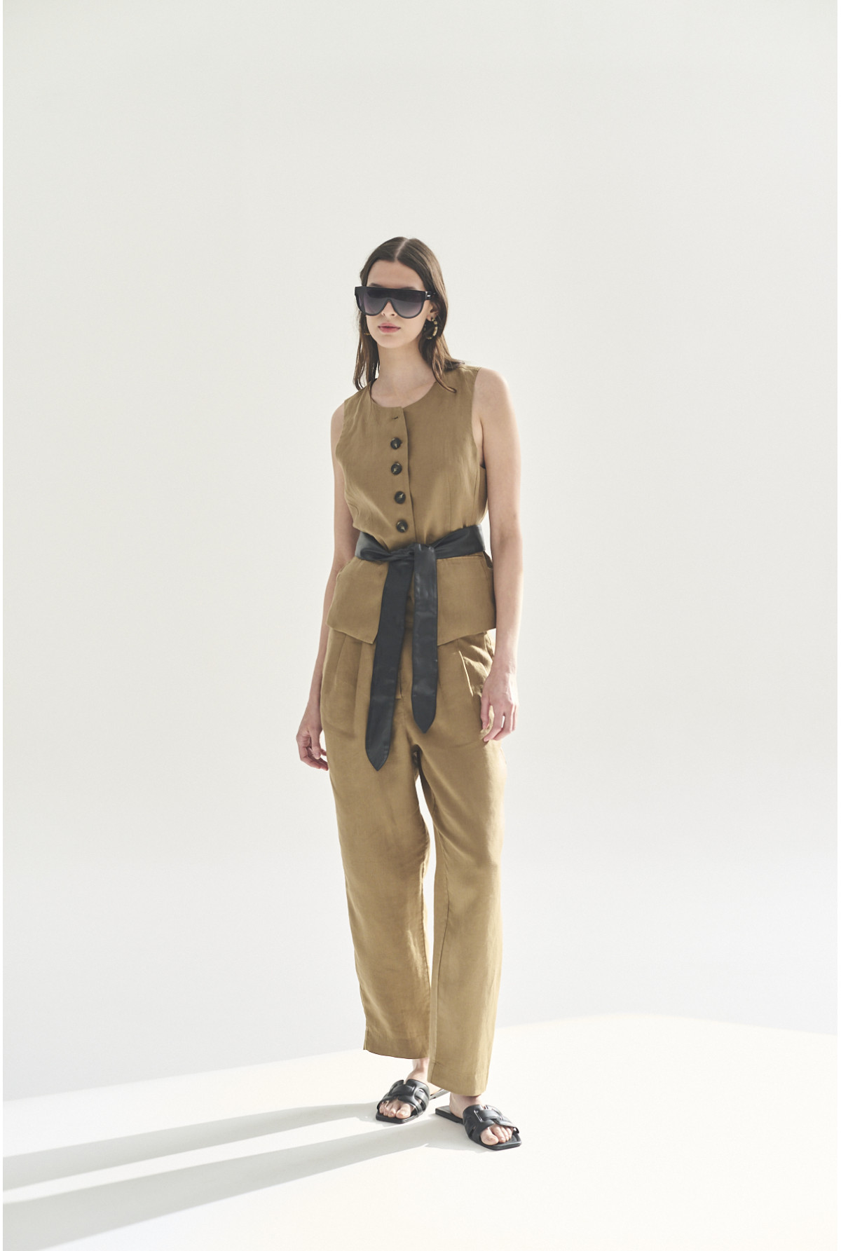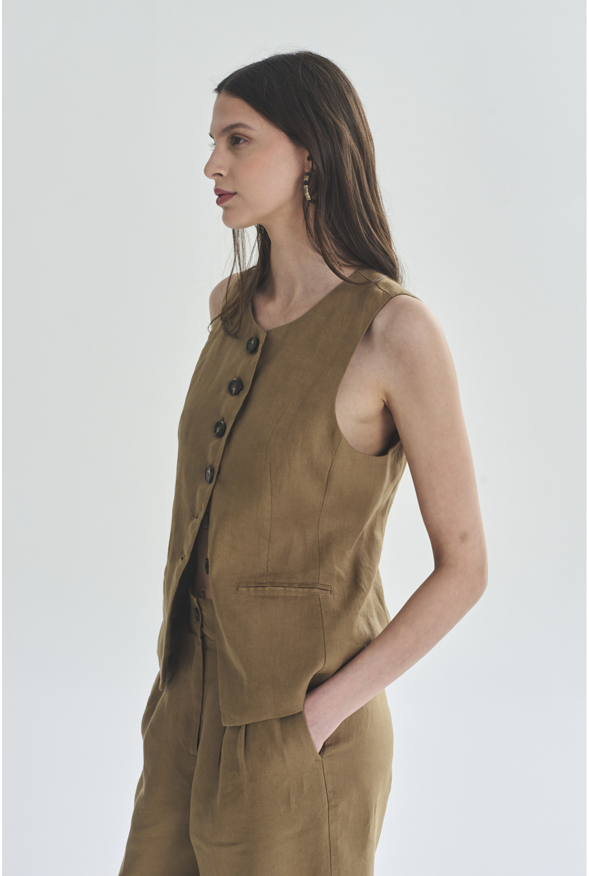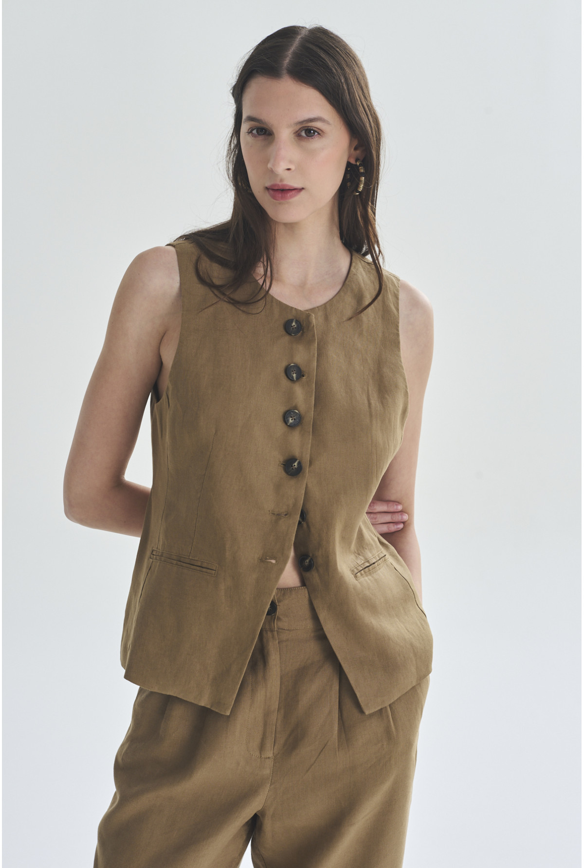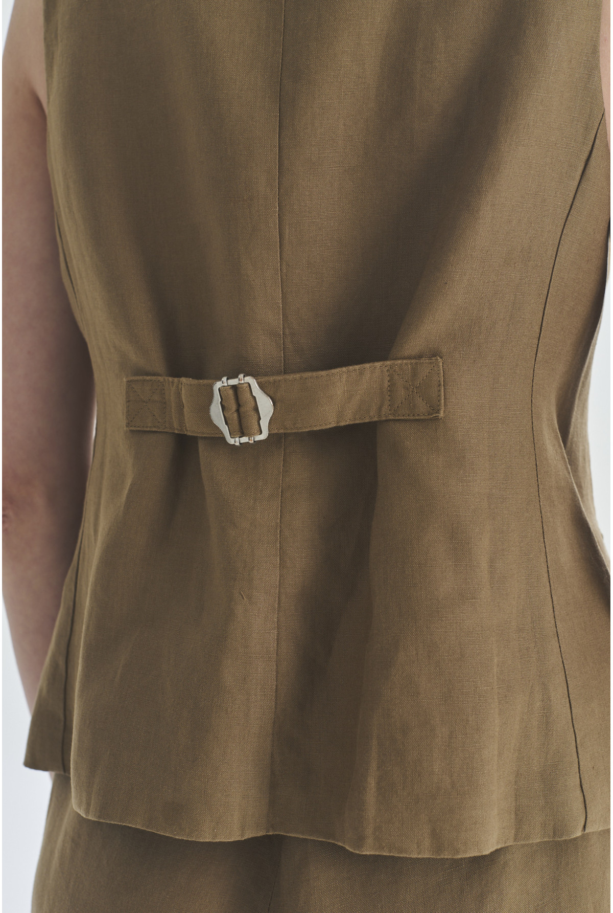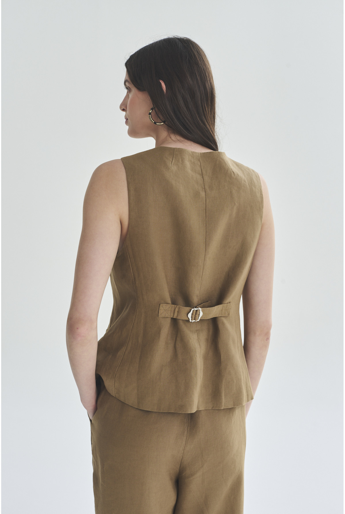 Chaleco 100% lino, con escote en U,pinzas delanteras y seis botones.para su cierre. Cuenta con una martingala en espalda con hebilla metálica y su interior forrado.