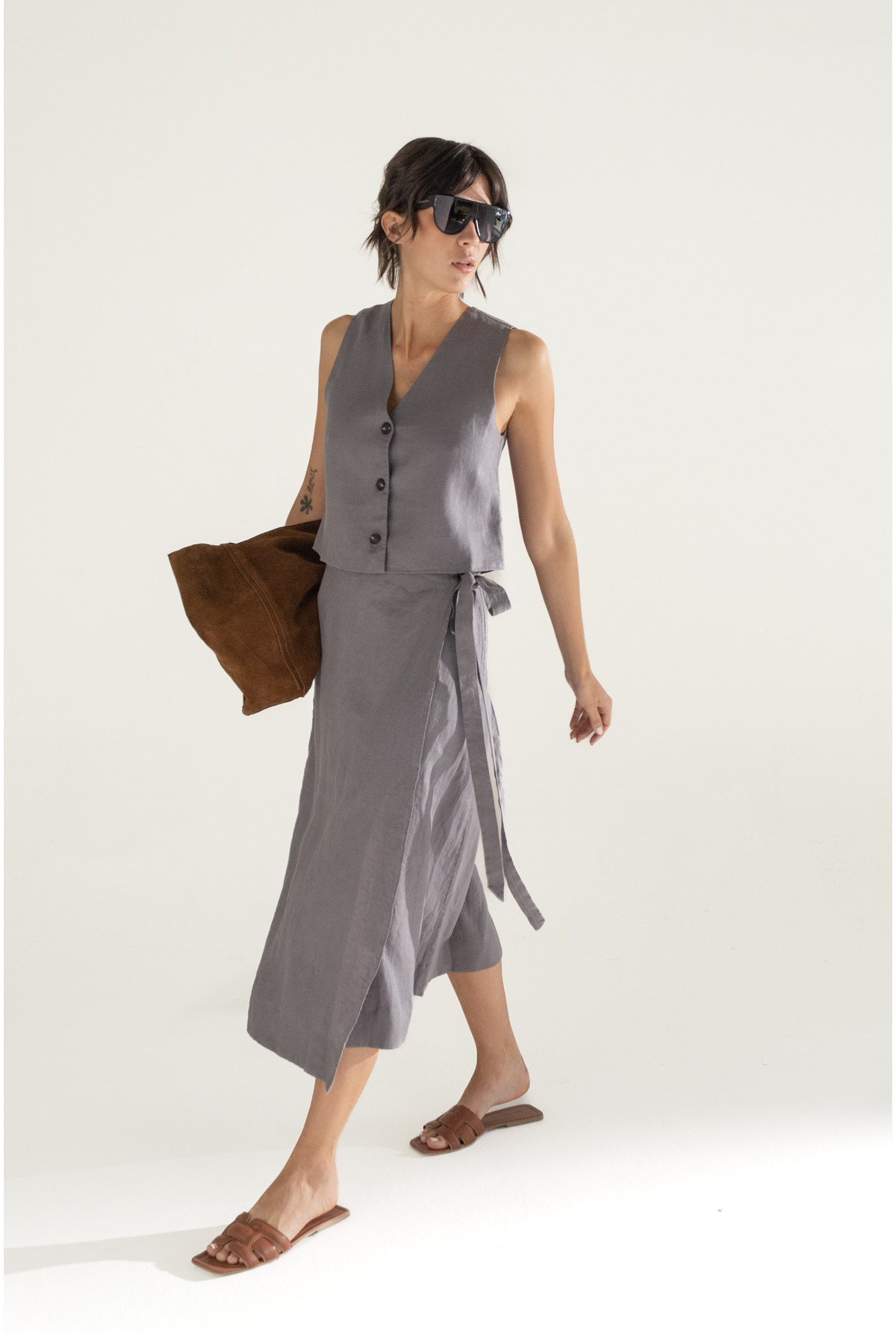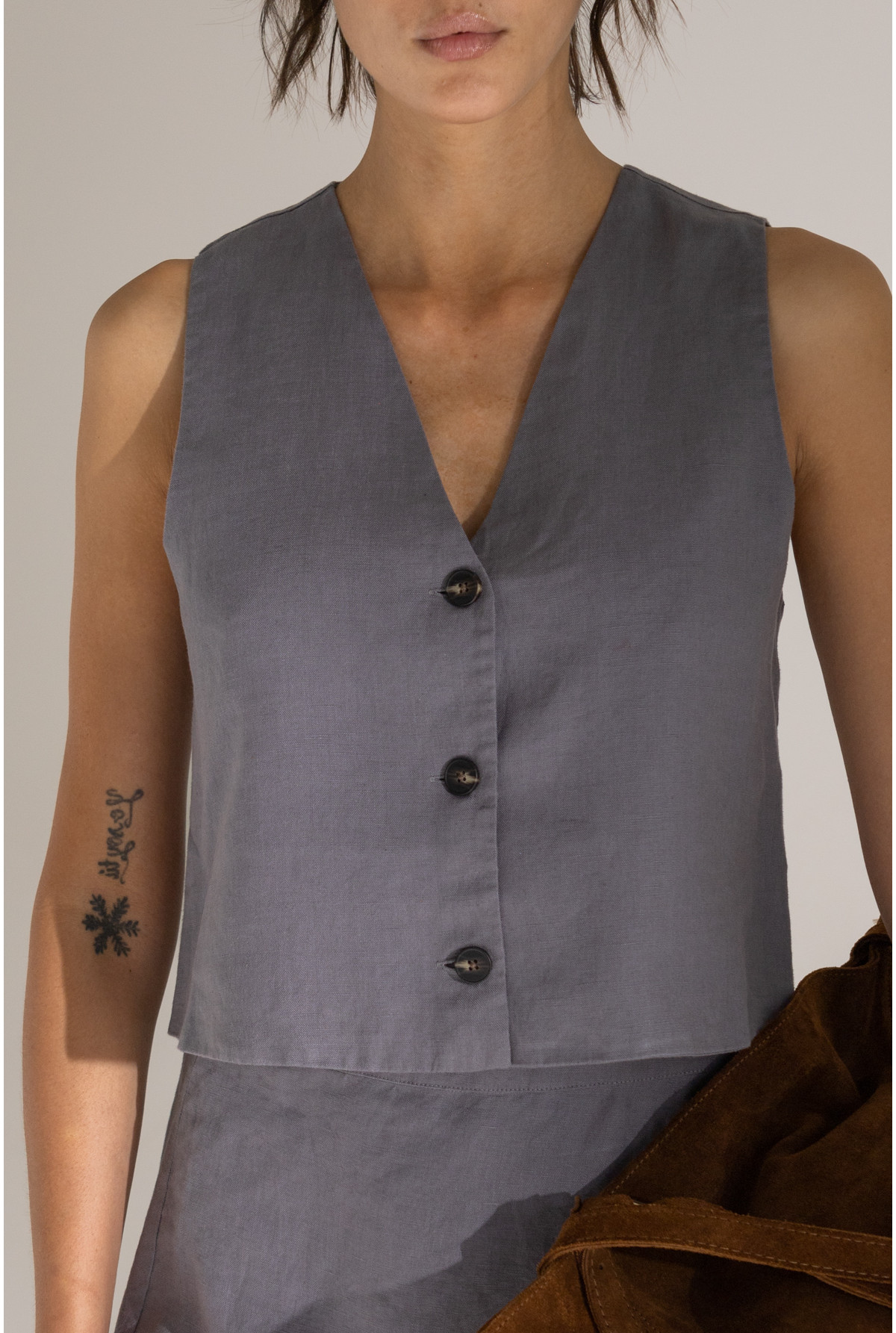 Chaleco 100% Lino, doble tela, con escote V con tres botones en delantero.