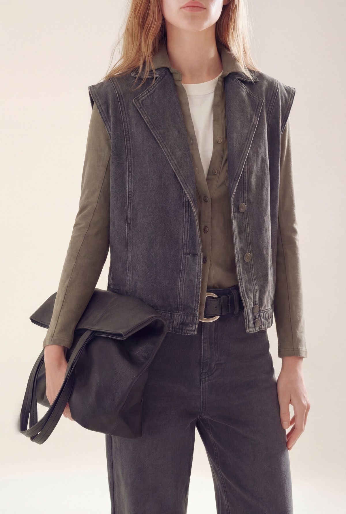 Chaleco con cuello y solapa. Botones jeaneros y cintura.