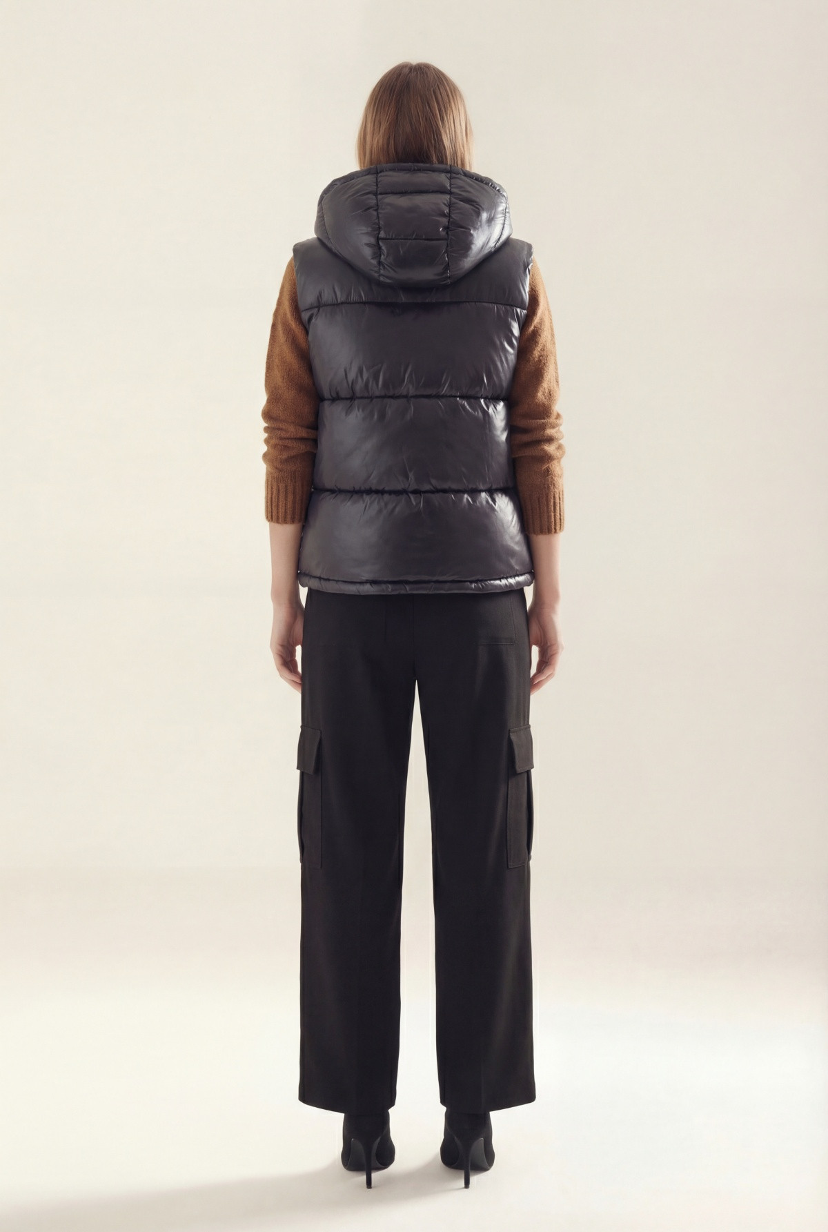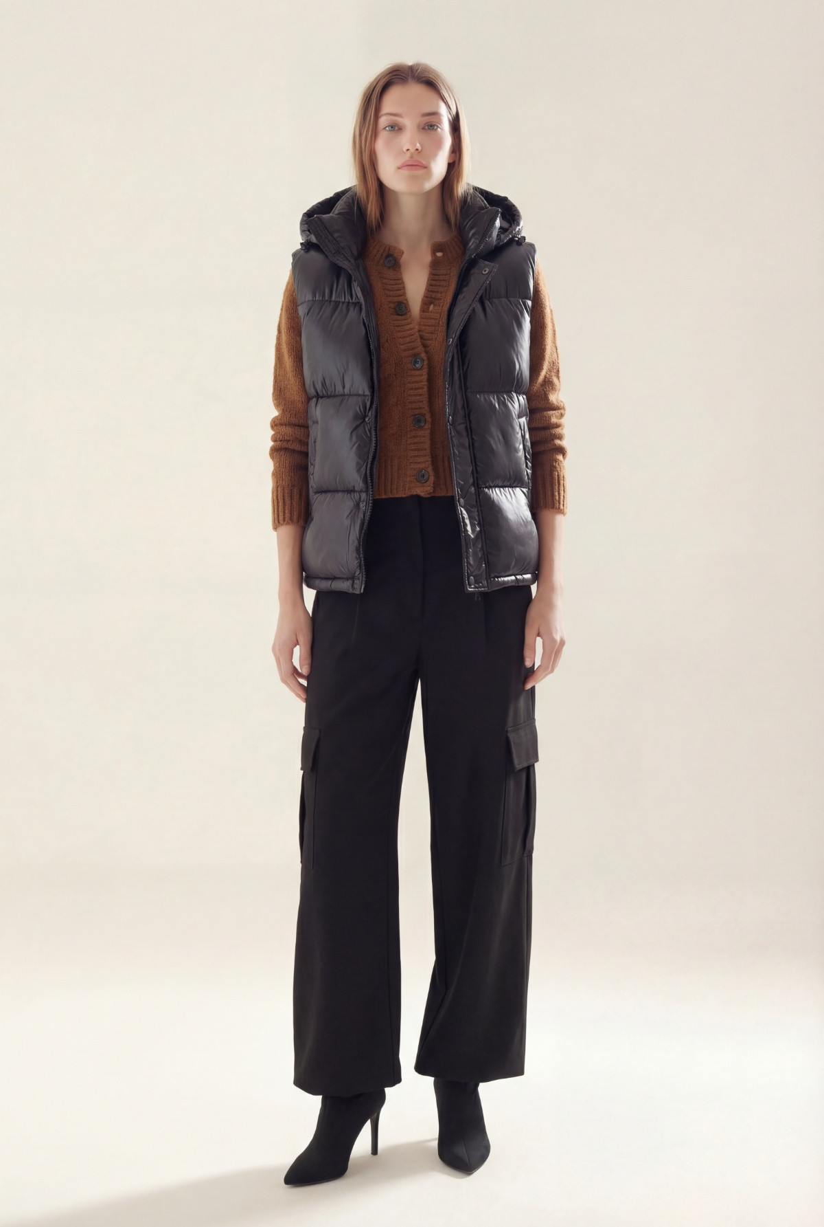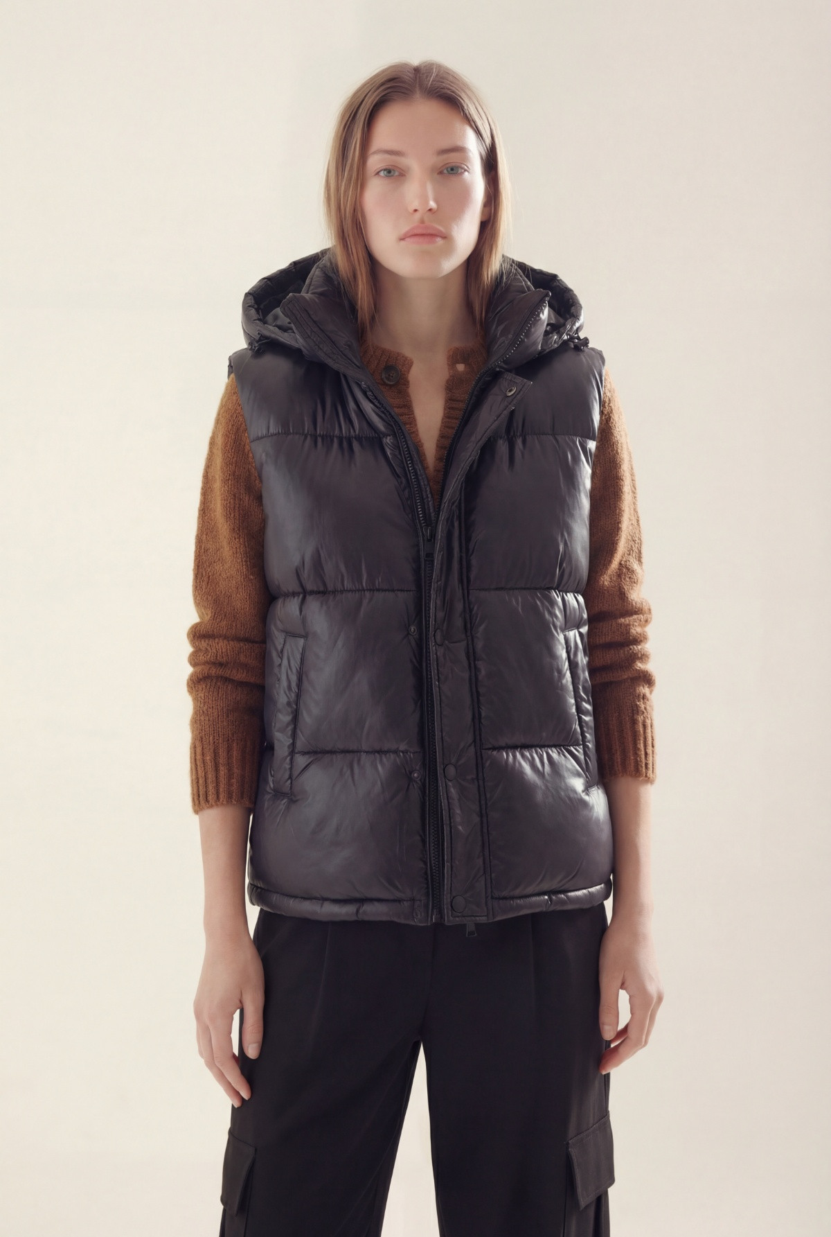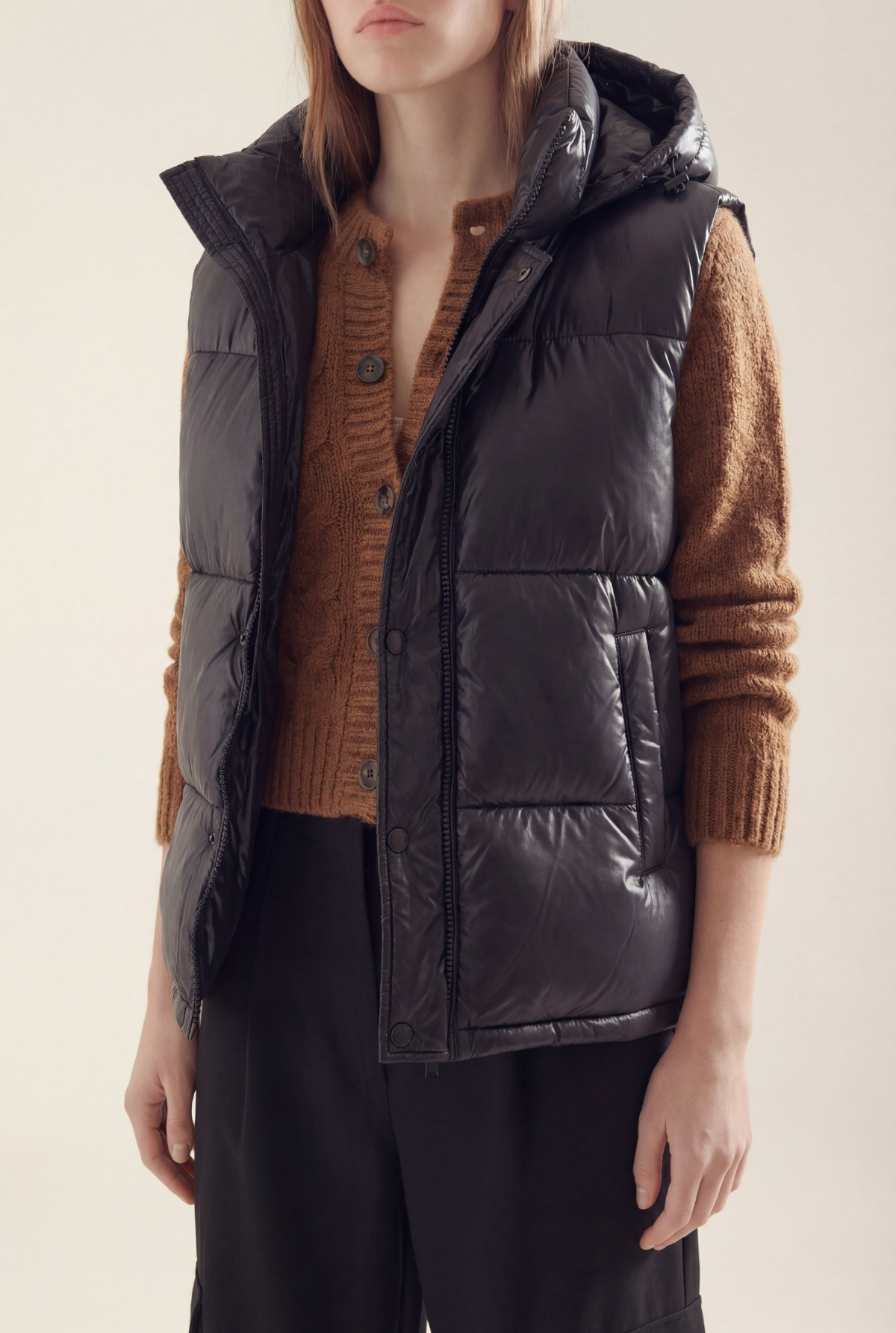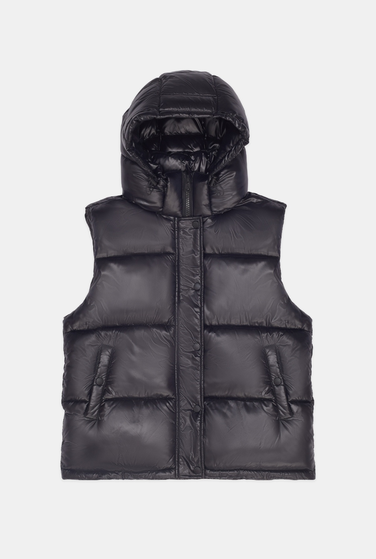 Chaleco con relleno simil pluma, cartera con cierre en interior y broches al tono en exterior.Capucha desmontable con velcro.Bolsillos laterales con polar en interior y broche para cerrar.Bolsillo interior con cierre.