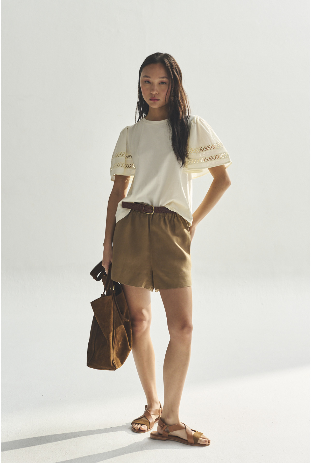 Remera con escote redondo y volados con puntilla en mangas. Calce amplio