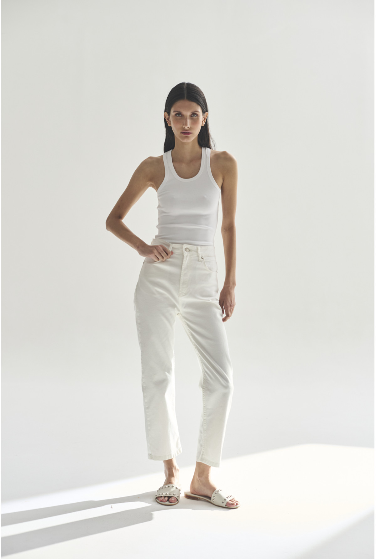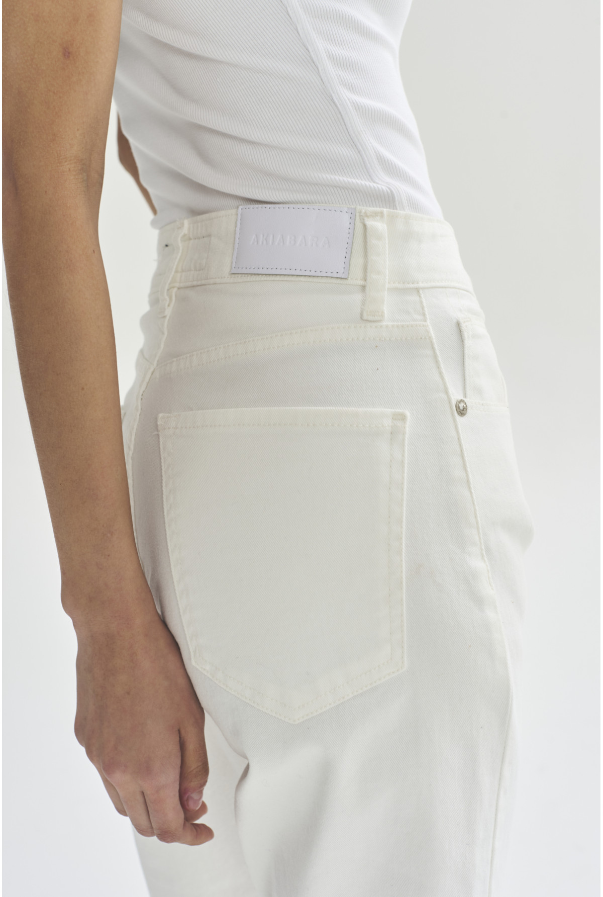 Jean tiro super alto, pierna recta, largo por arriba del tobillo. Color crudo.