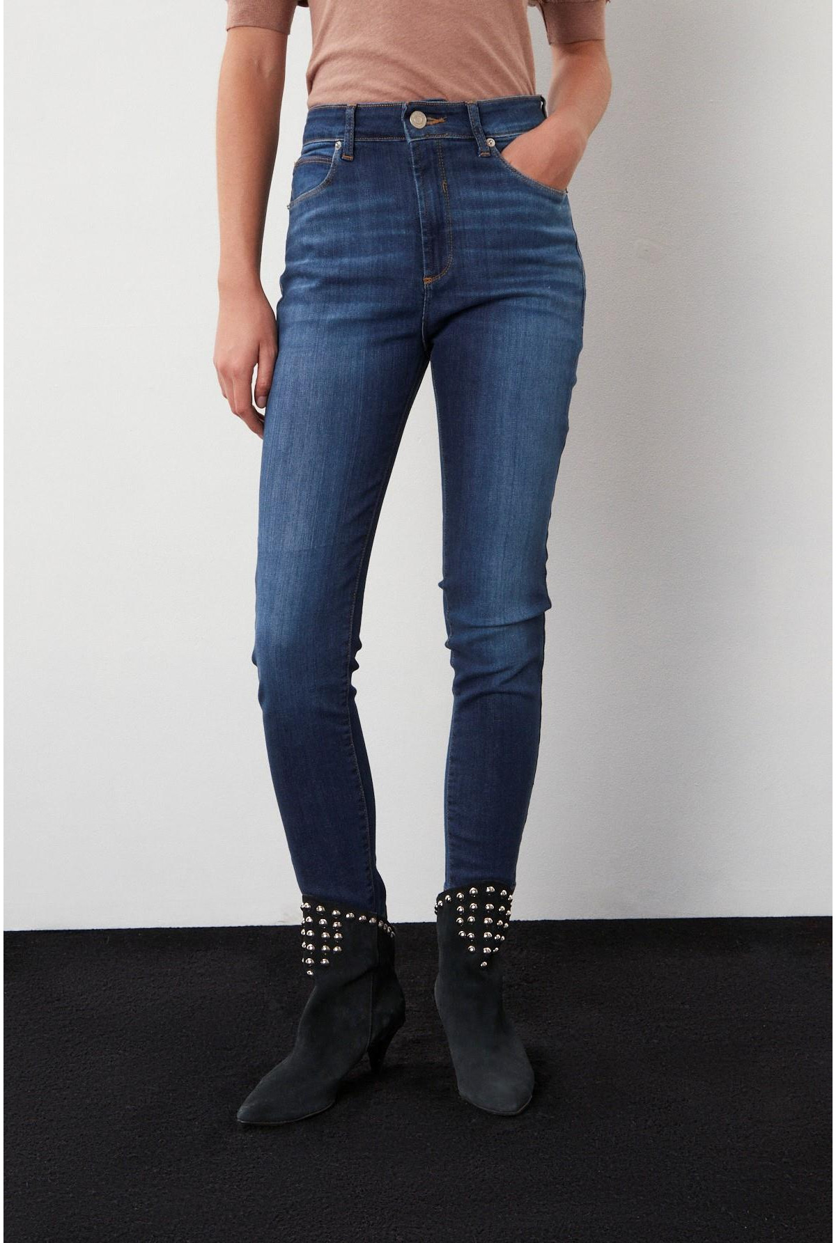 Jean skinny tiro alto, largo hasta el tobillo. Lavado azul medio con suave desgaste.