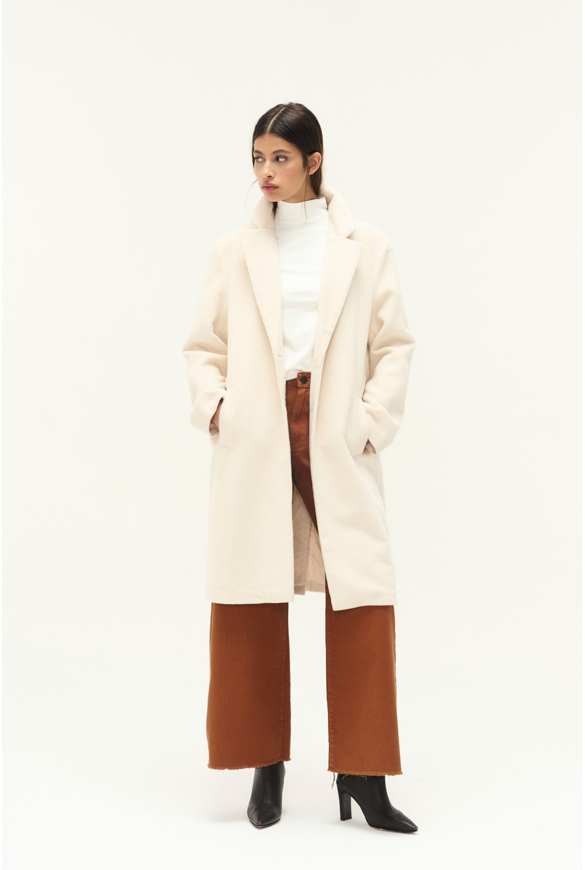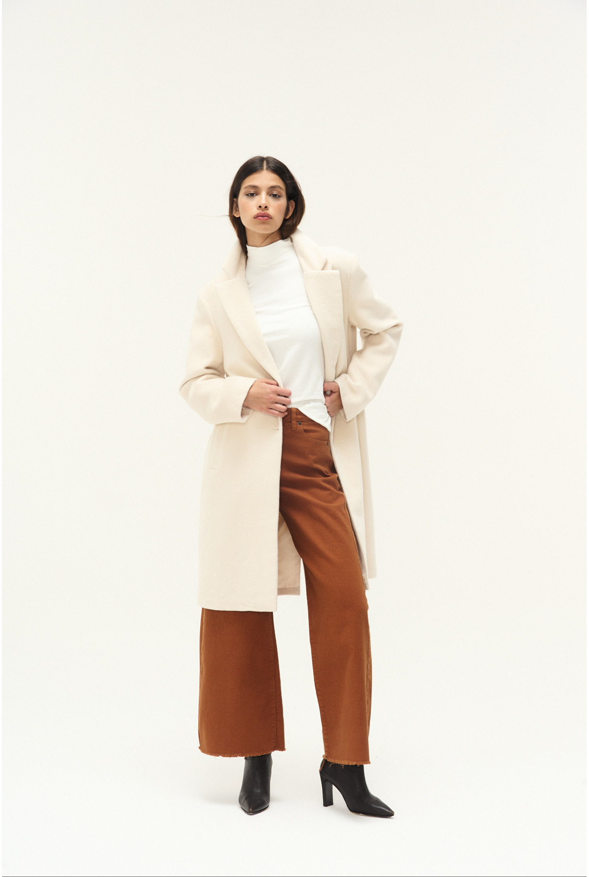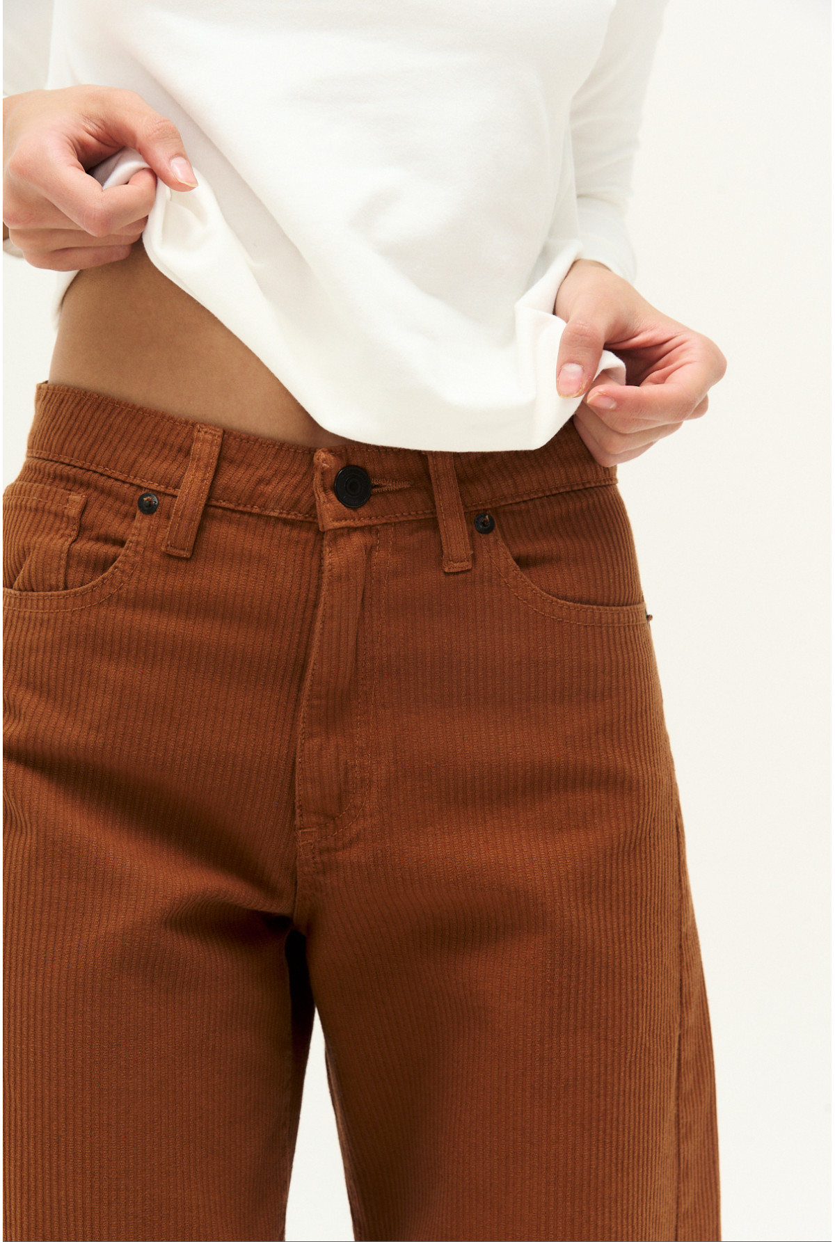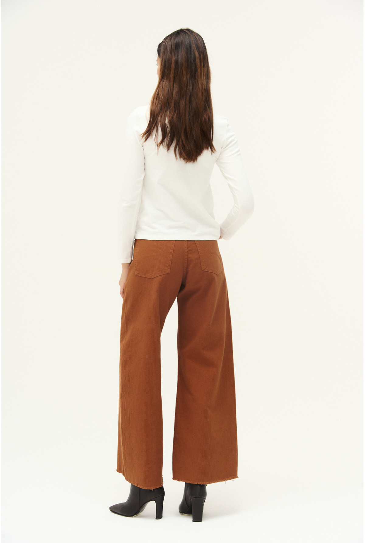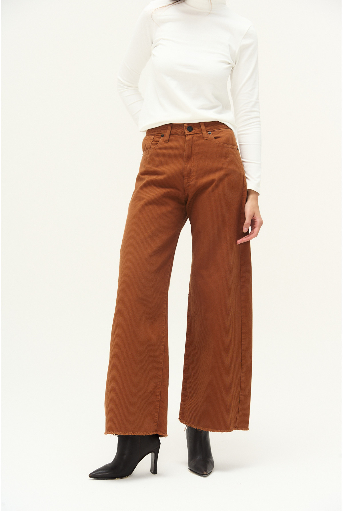 Jean efecto corderoy, tiro alto, super ancho. Color castaña.
