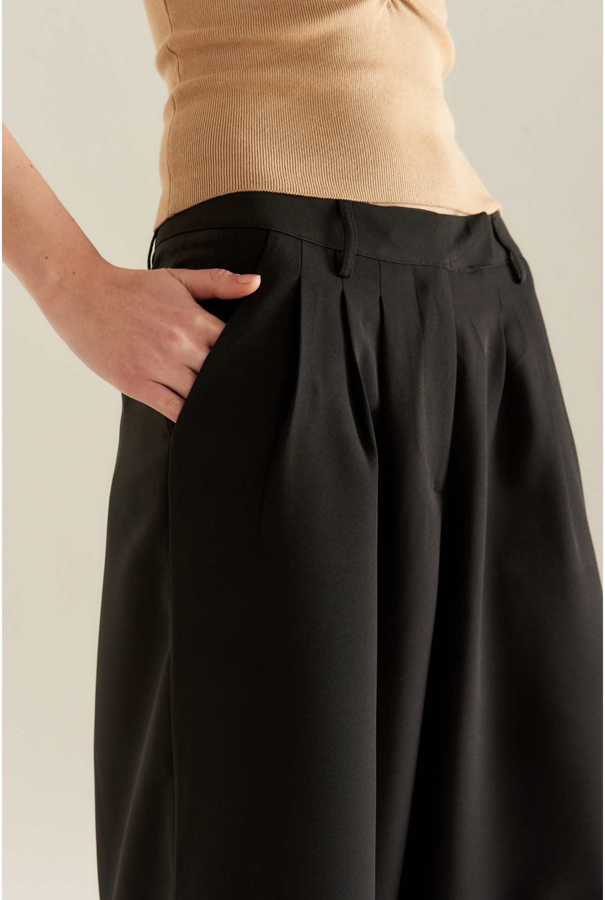 Pantalón sastrero tiro alto,pierna ancha. Cierre en delantero central y ganchos pantalones ocultos.