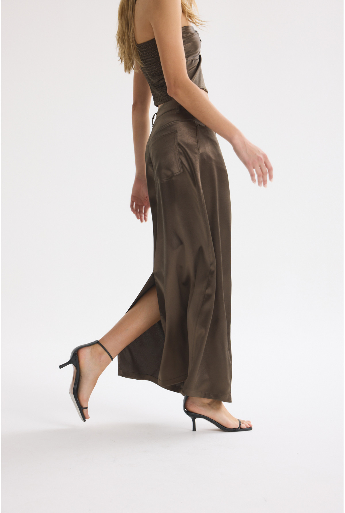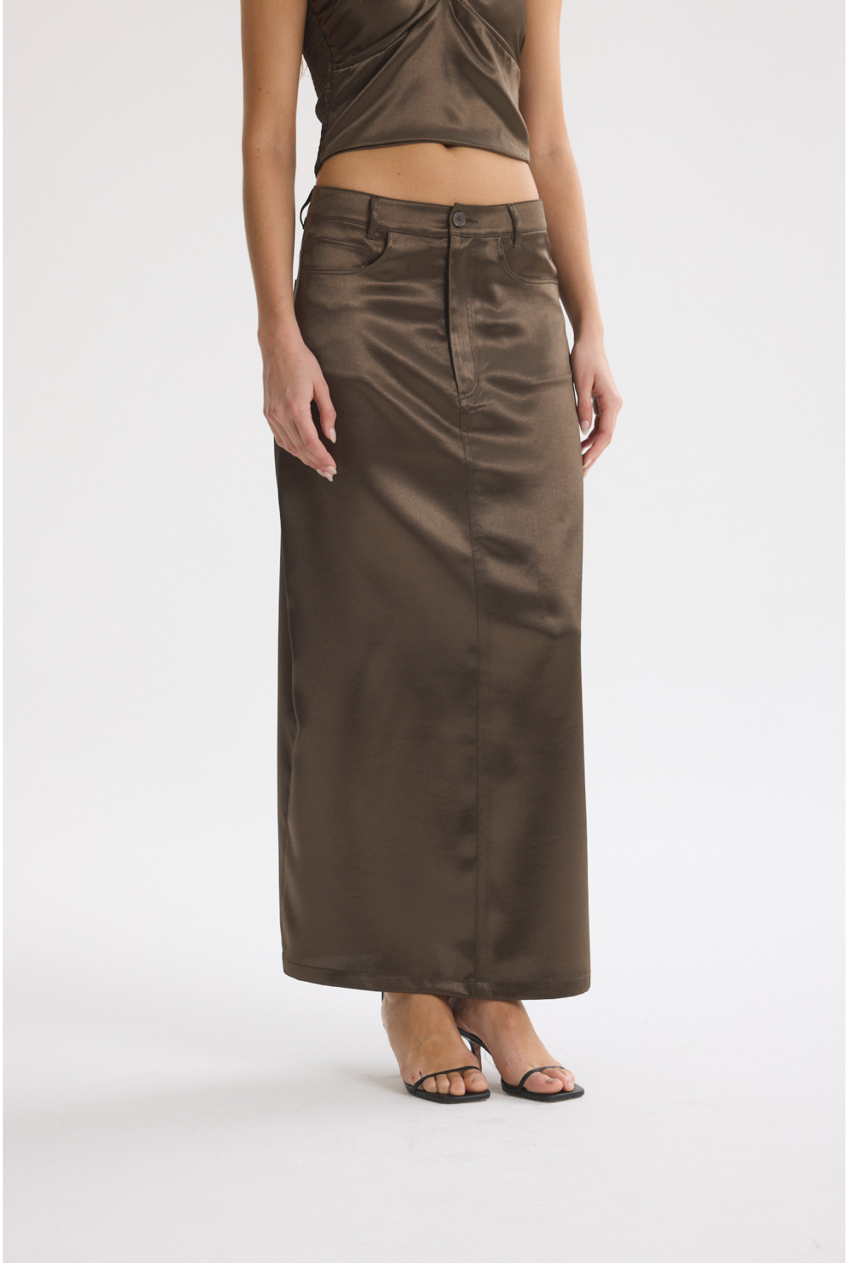 Pollera cinco bolsillos. Cierre y boton delanteros. Dos bolsillos delanteros en la cintura y dos bolsillos plaqué traseros. Tajo trasero.