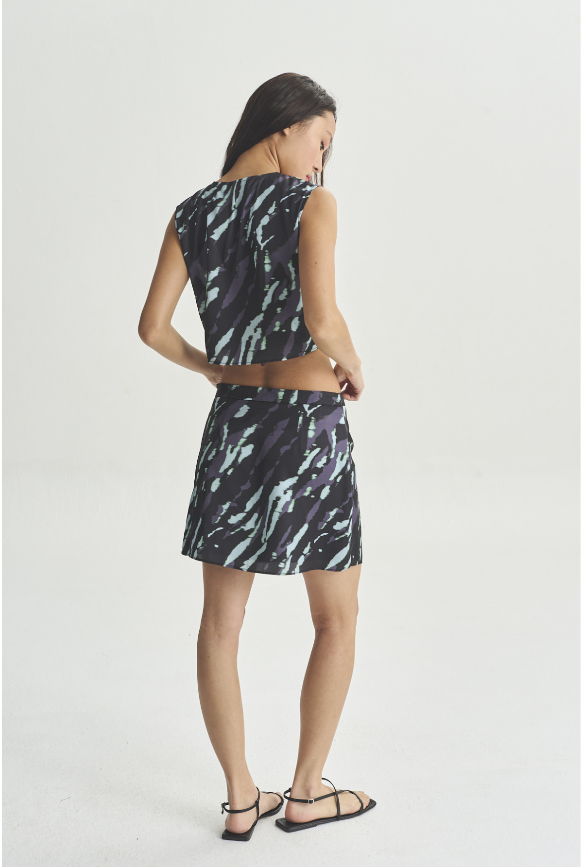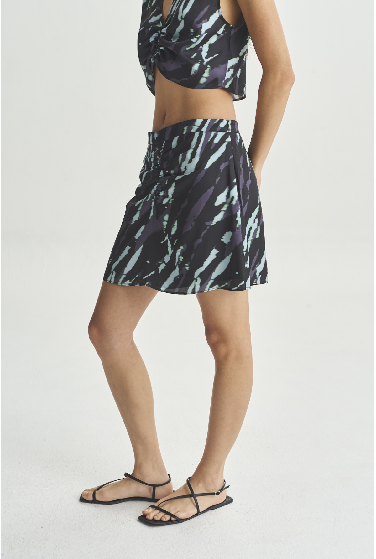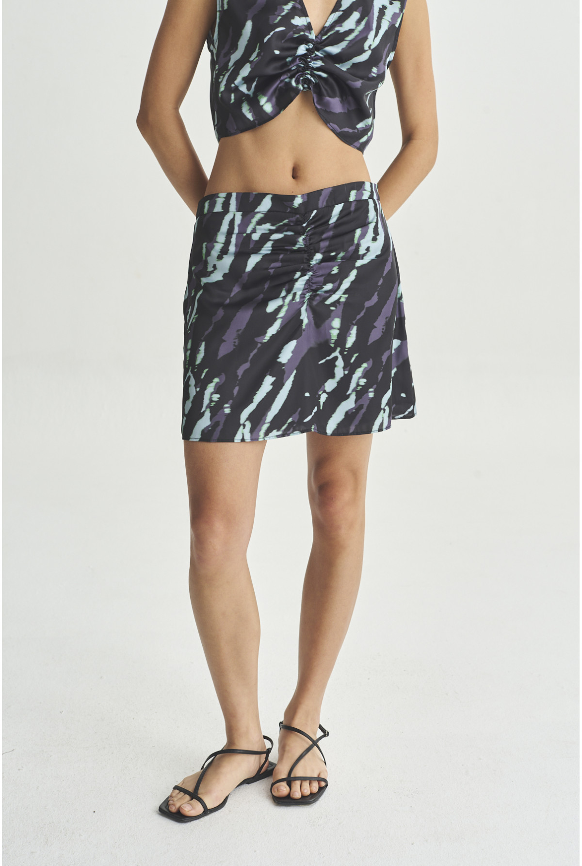 Pollera corta estampada con frunce en el centro delantero. Cierre invisible lateral. Forreria al tono.