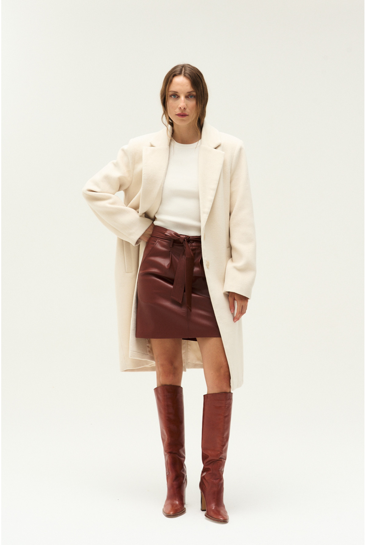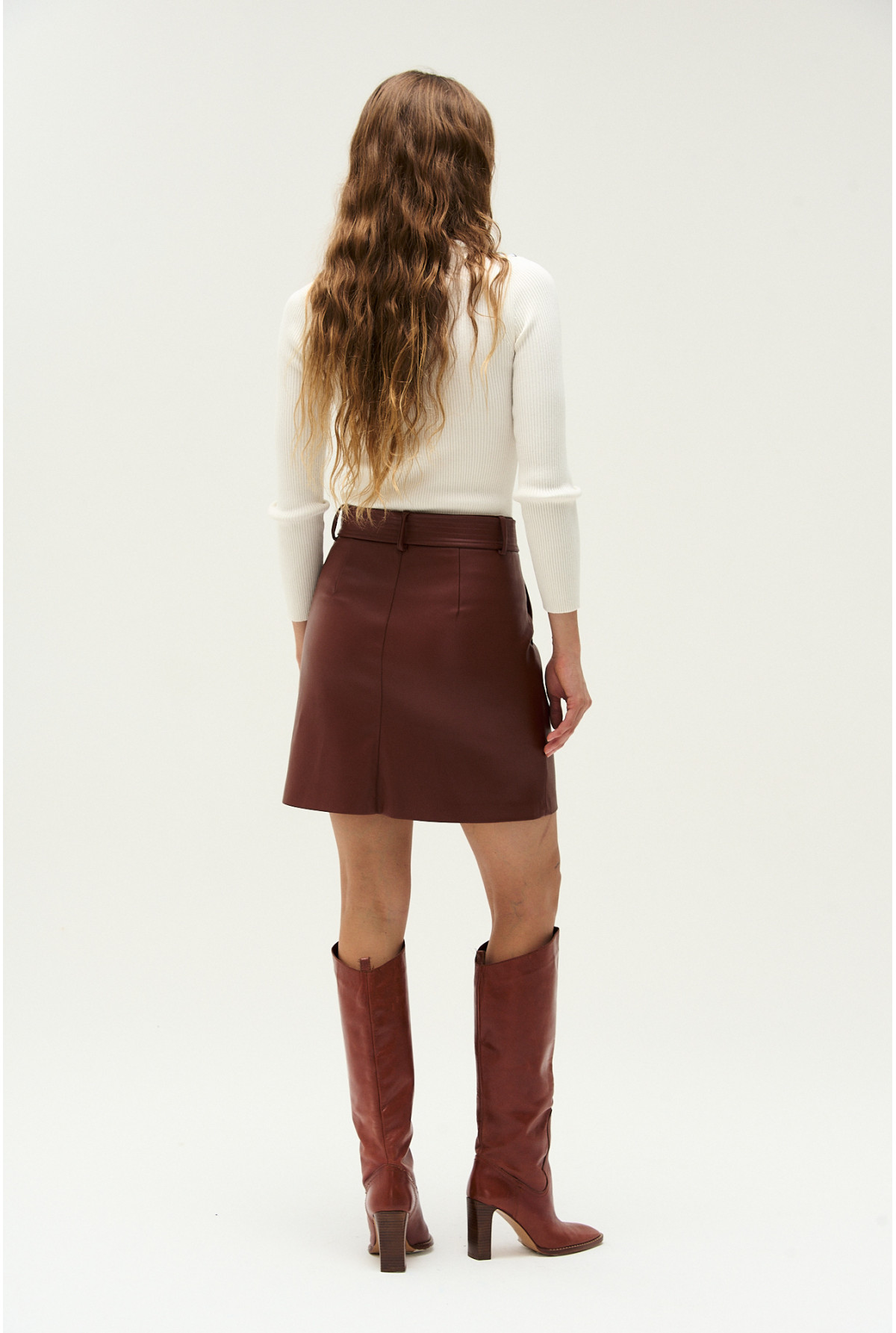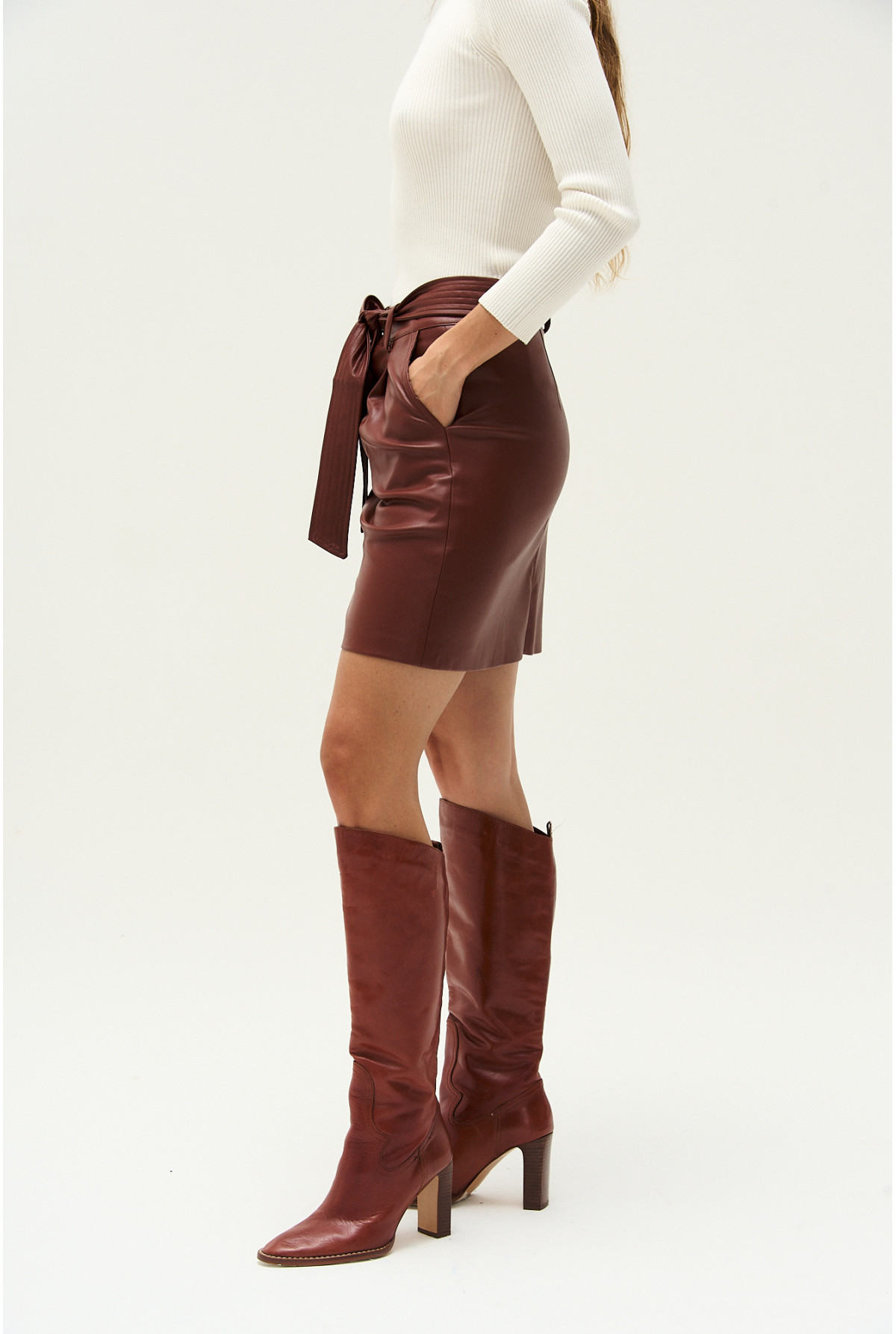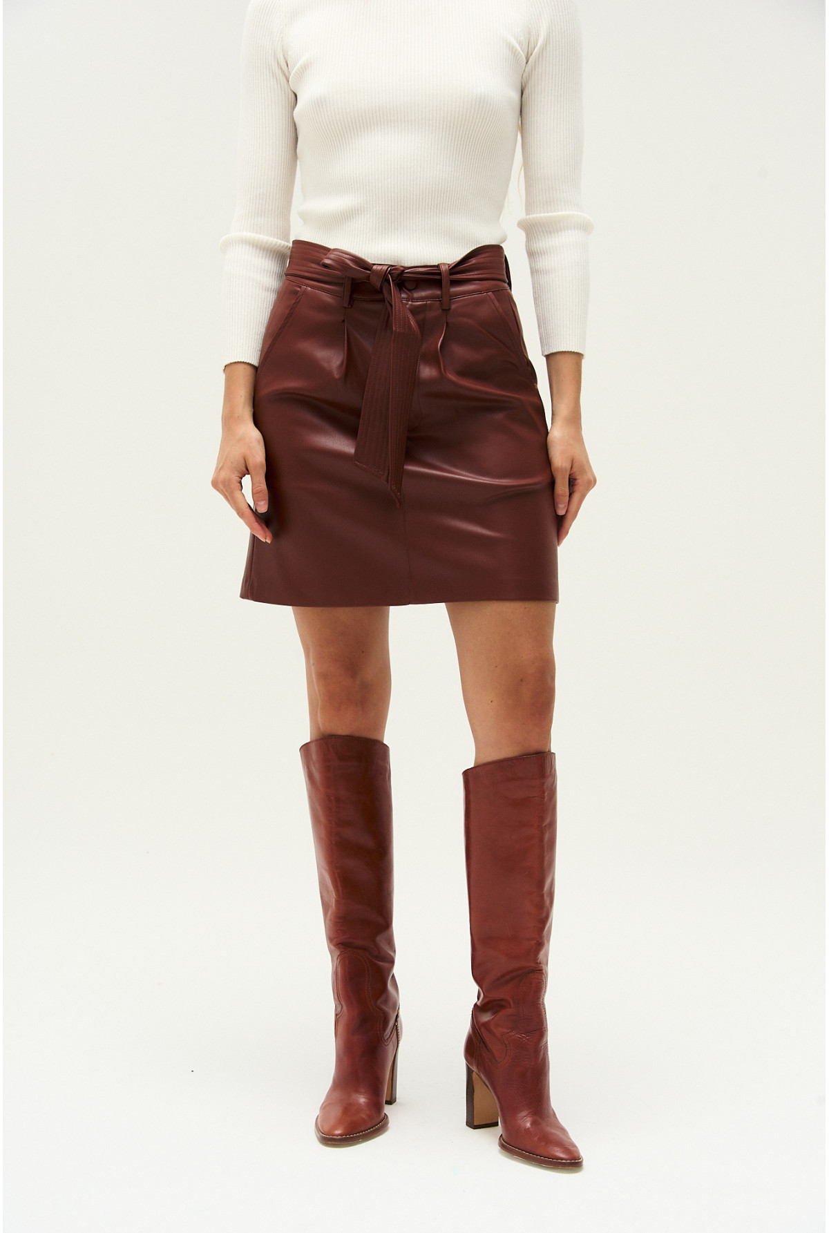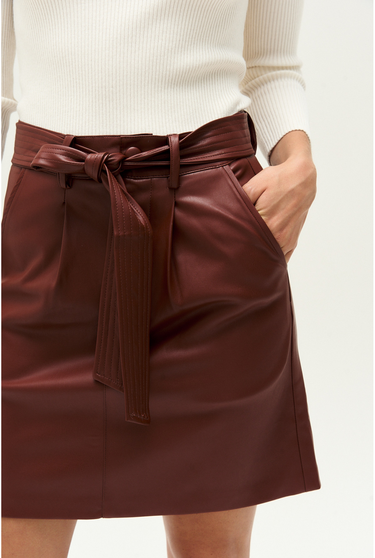 Mini de cuero sintetico, bolsillos en delantero y lazo desmontable con pespuntes.
