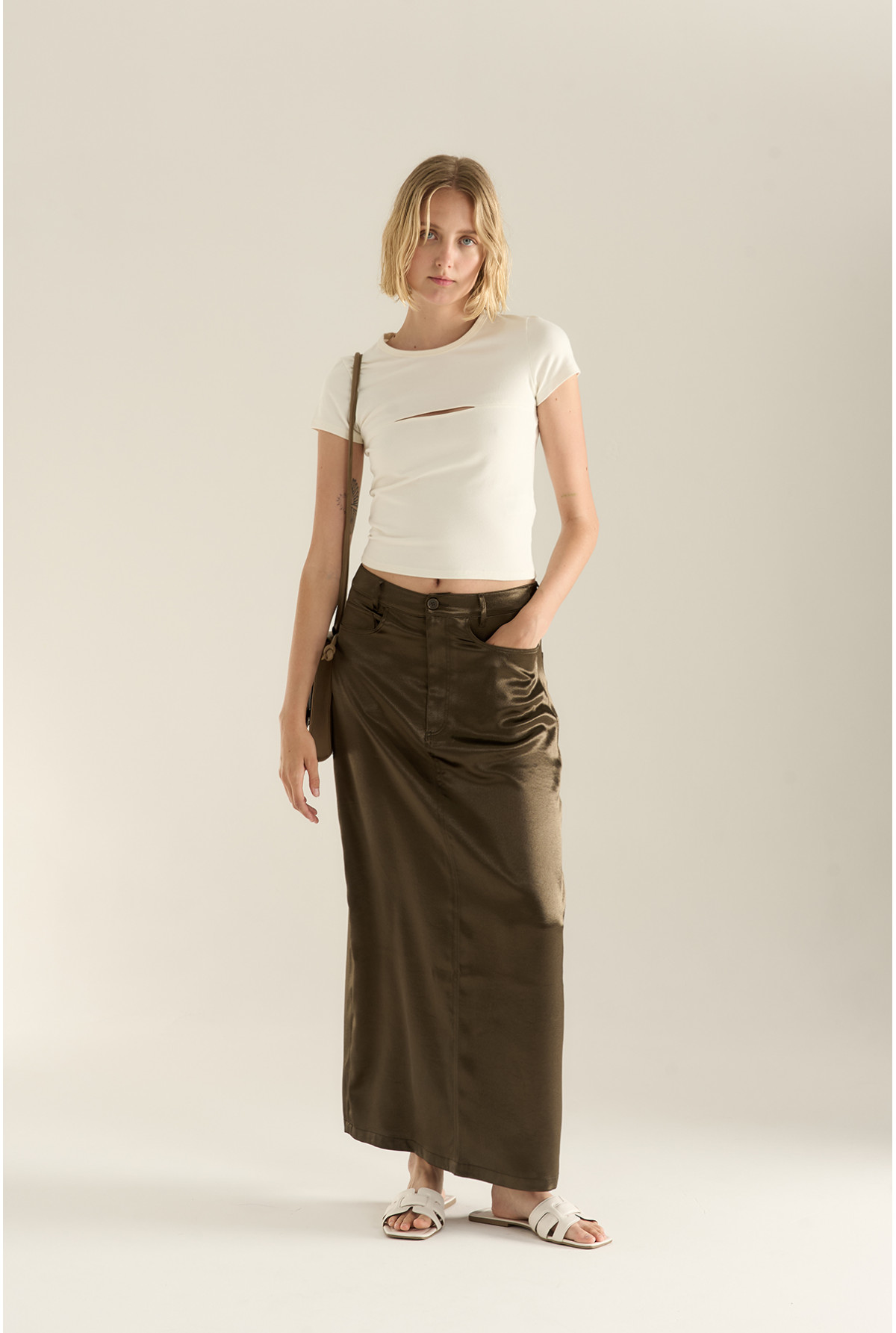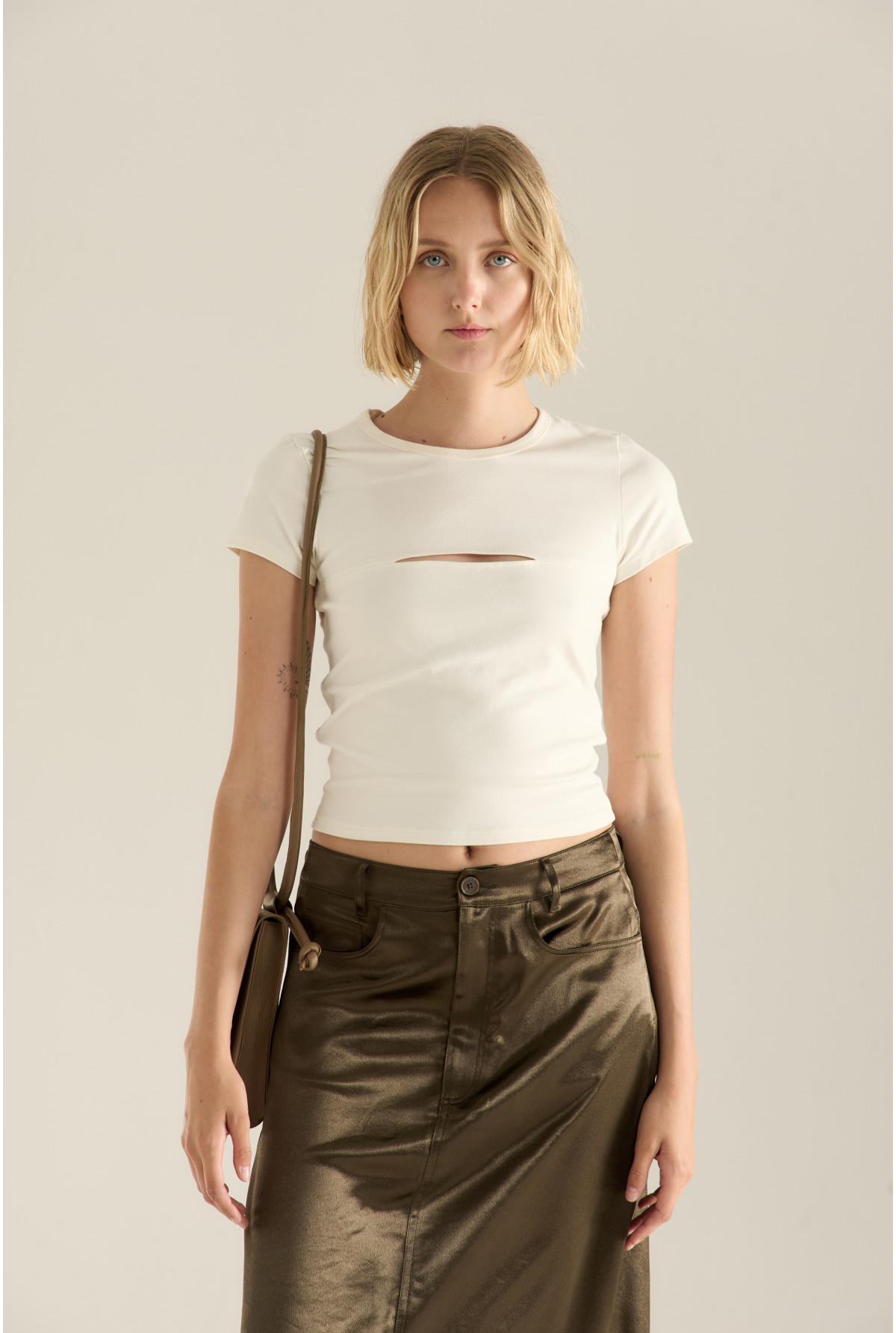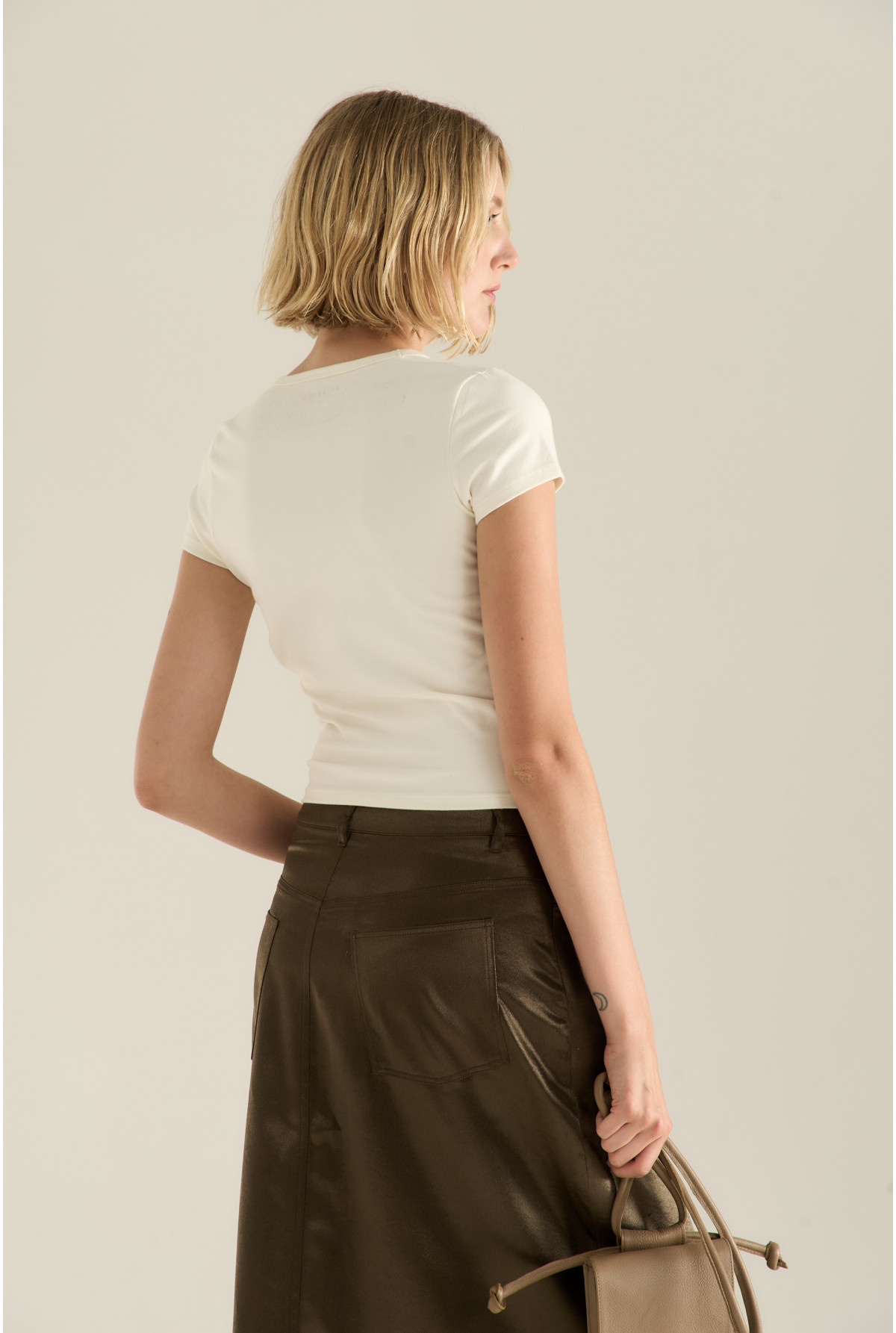 Remera escote redondo manga corta. con abertura en delantero. Confeccionada en tela de algodón con elastano. Calce fit.