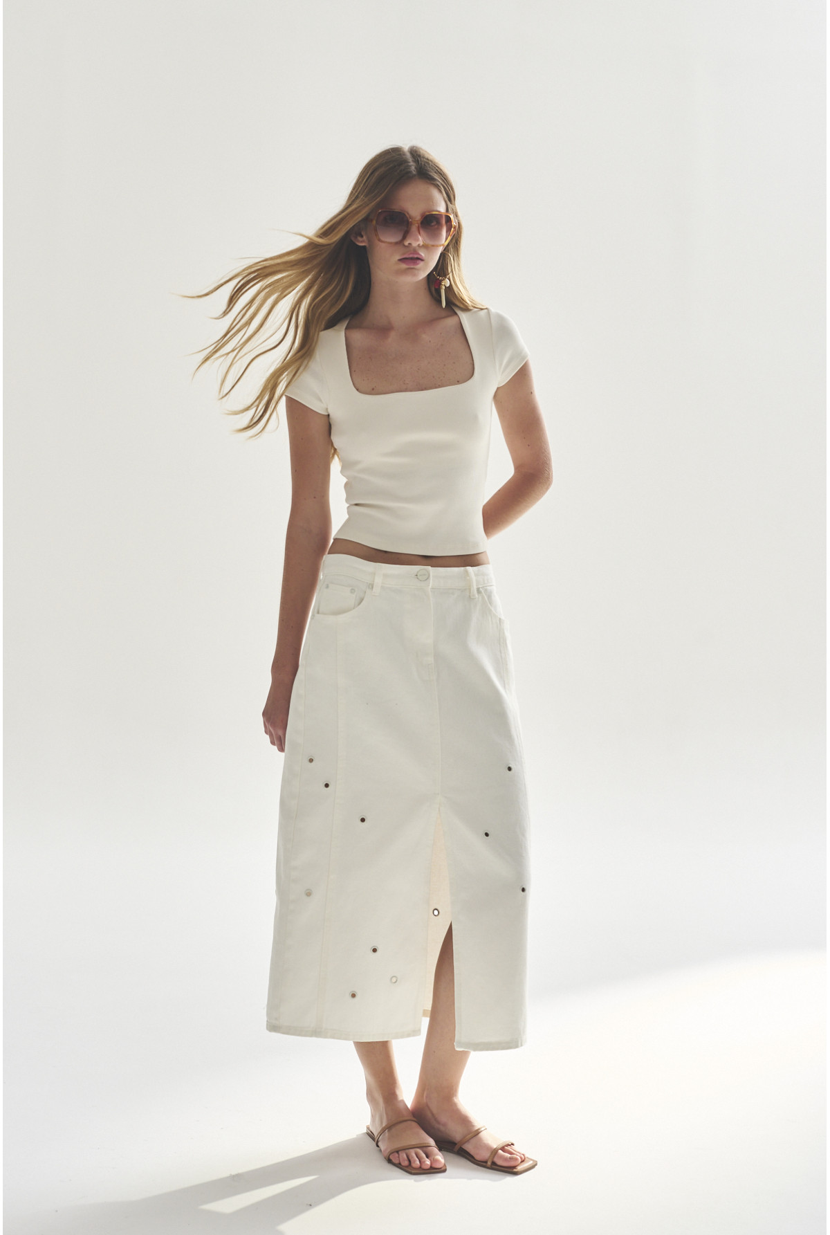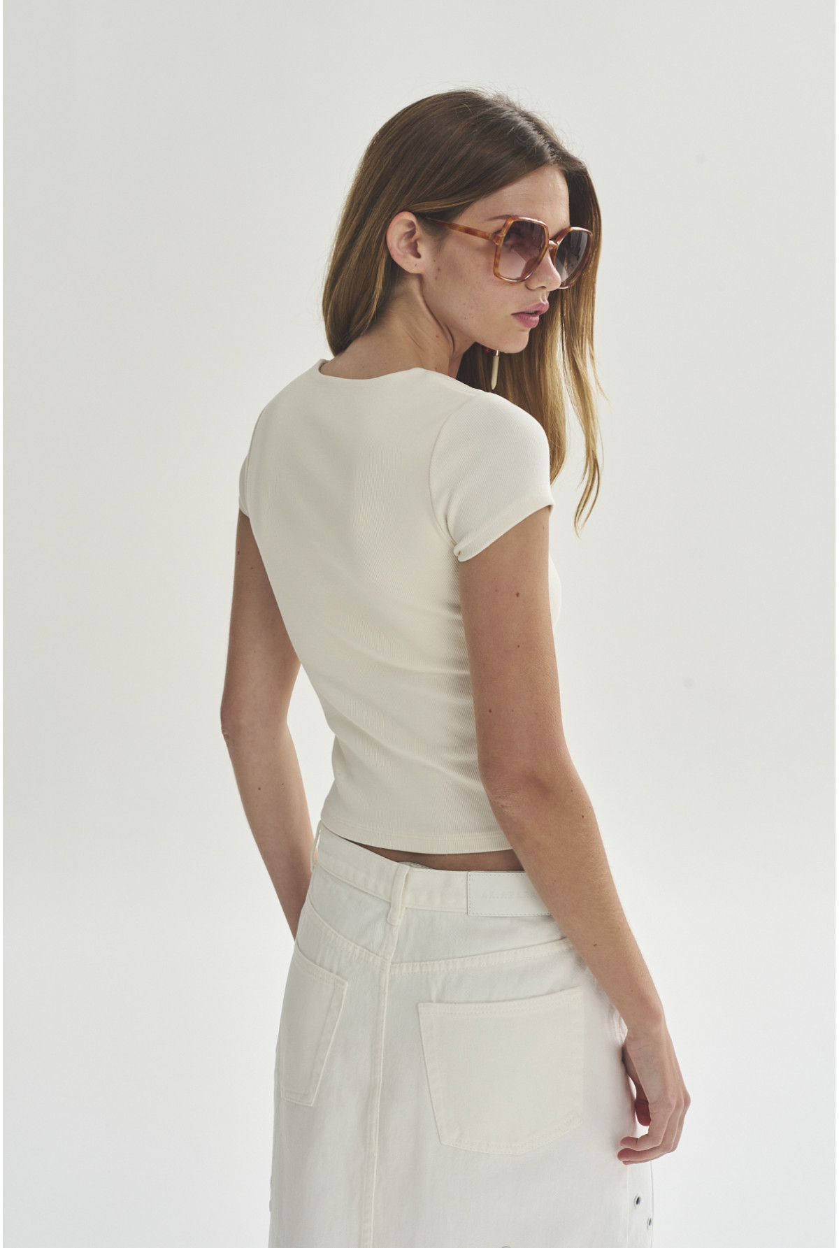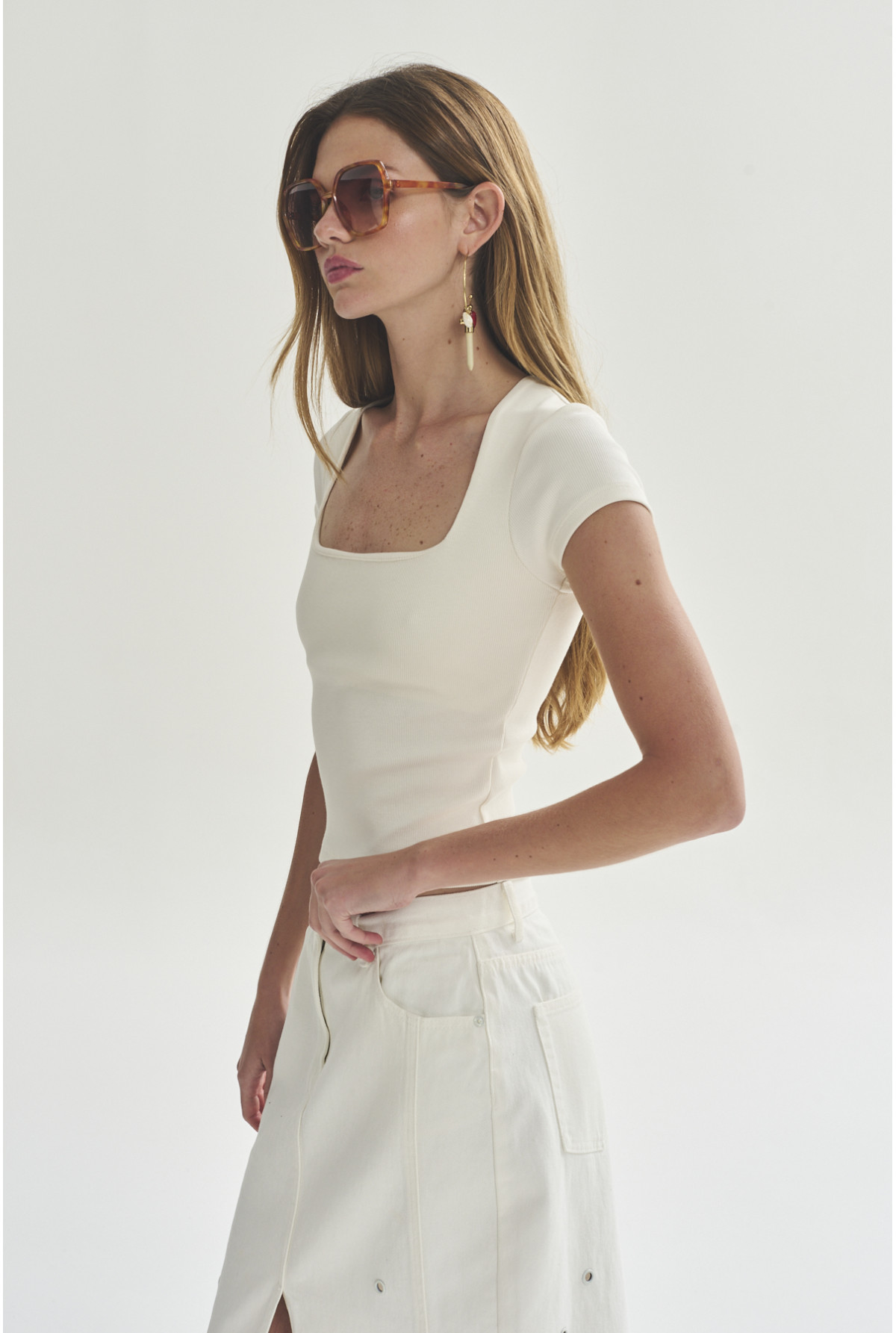 Remera de morley de Algodón Pima con escote cuadrado y mangas cortas. Con detalle de corpiño interno. Calce Fit