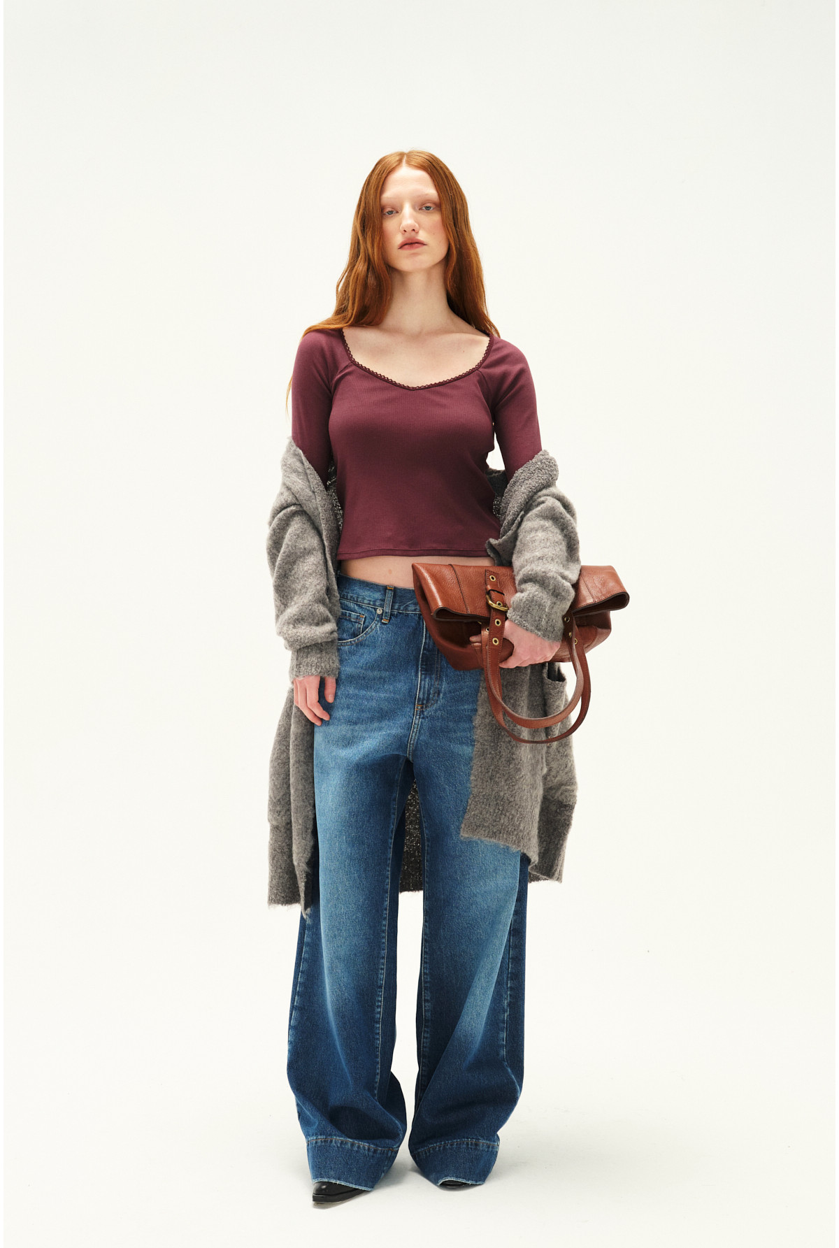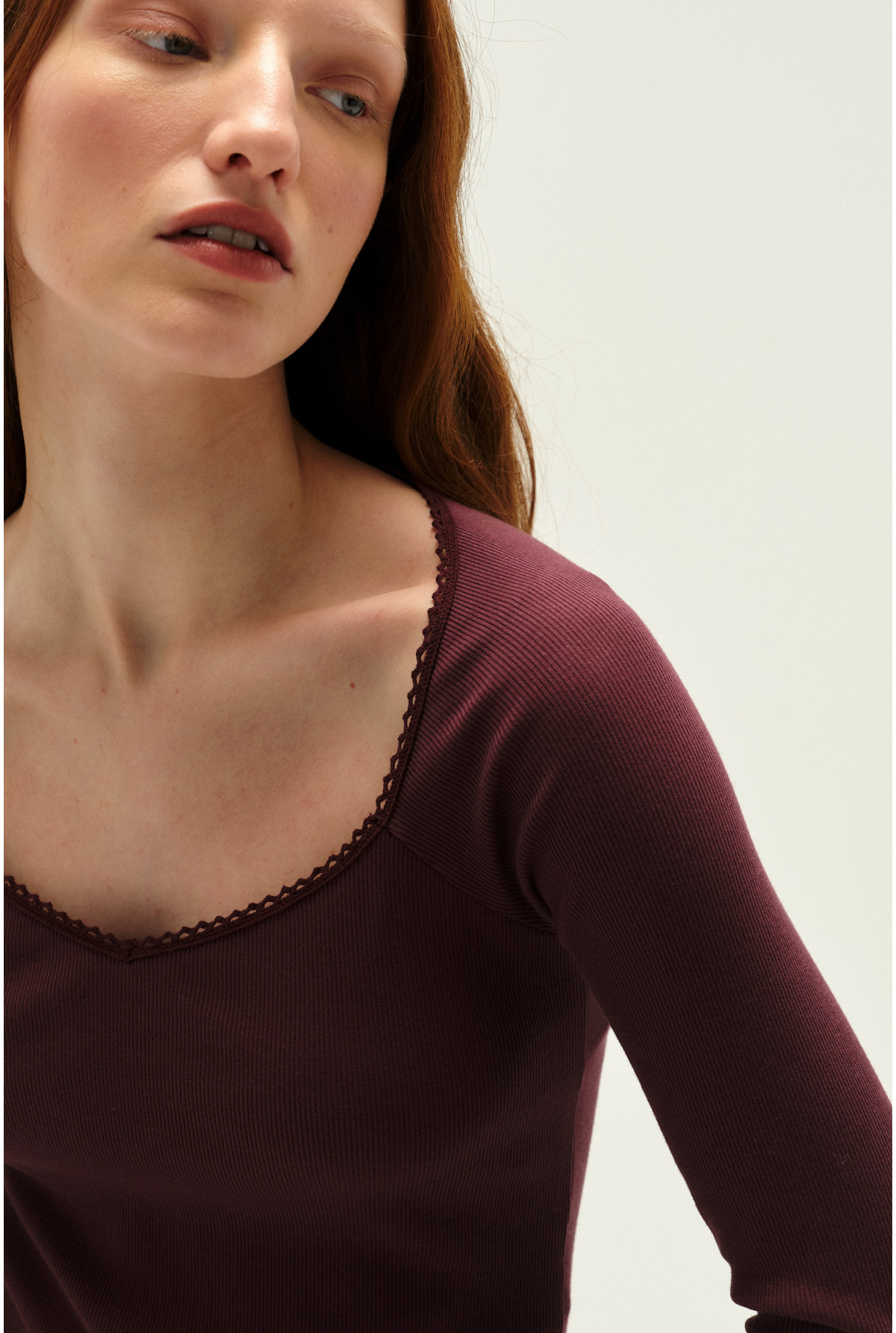 Remera con escote cuadrado en v y con detalle de puntilla. Tiene mangas largas. Calce Fit