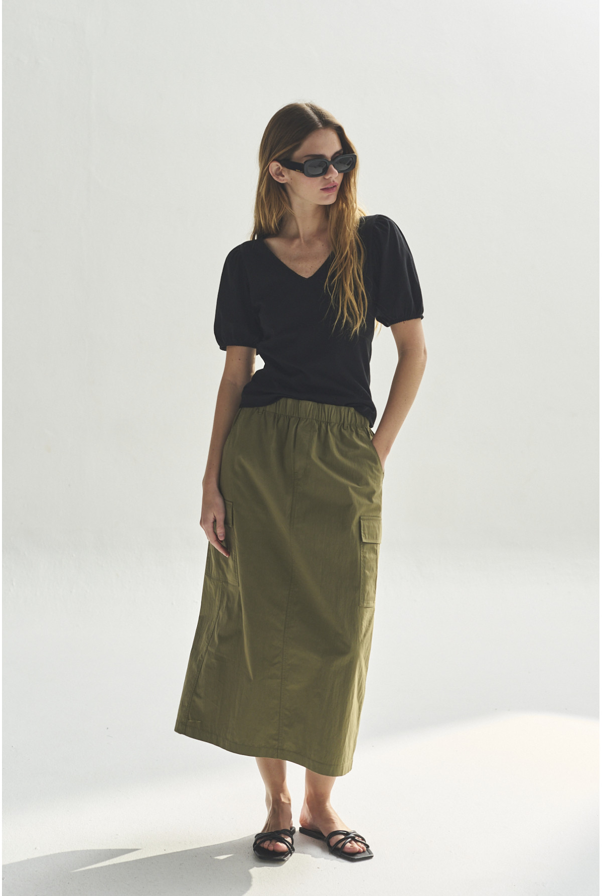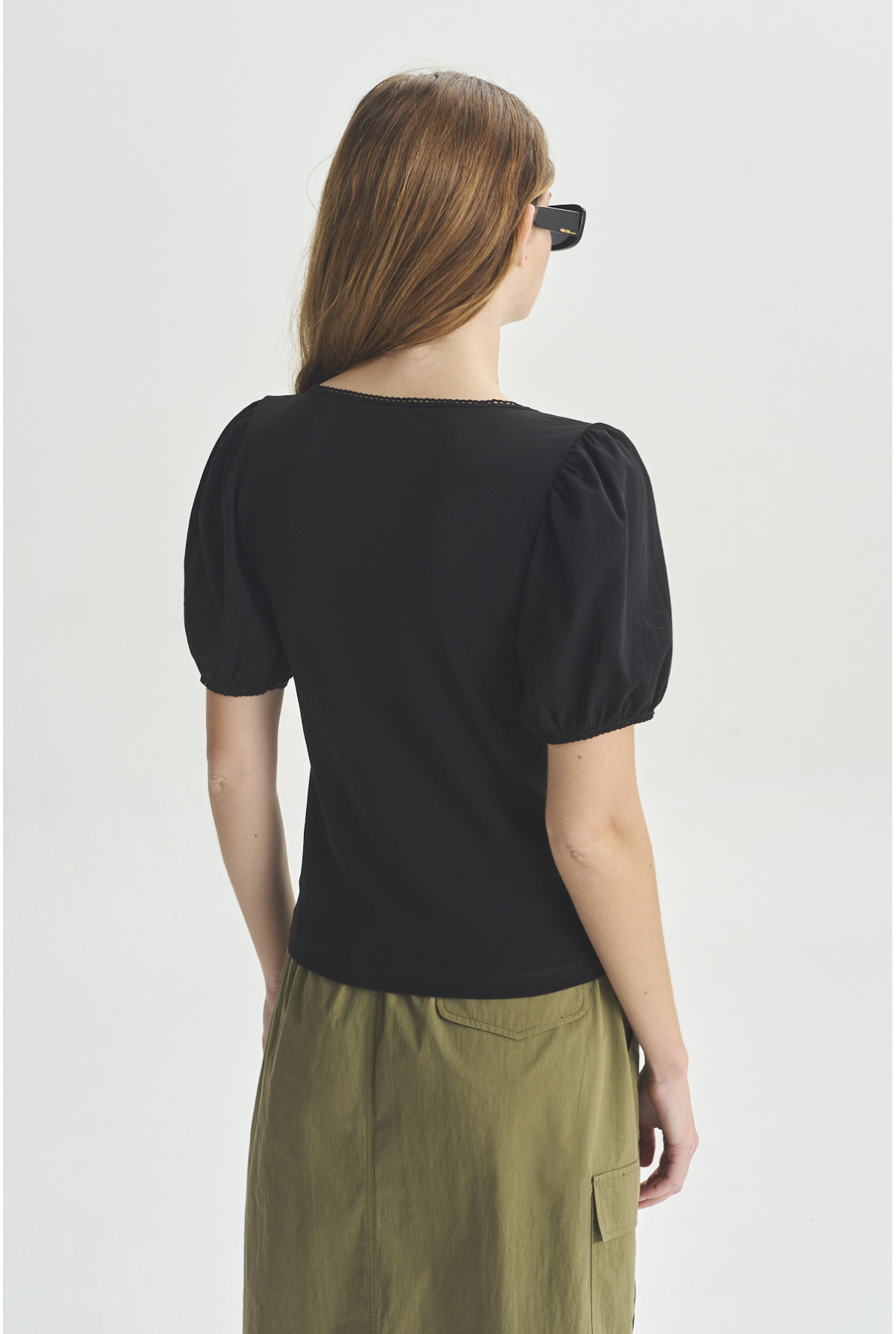 Remera confeccionada en 100% Algodón Peruano. Escote en V y mangas al codo con frunces en hombro y puños. Terminación en escote y puños con puntilla. Calce Recto.