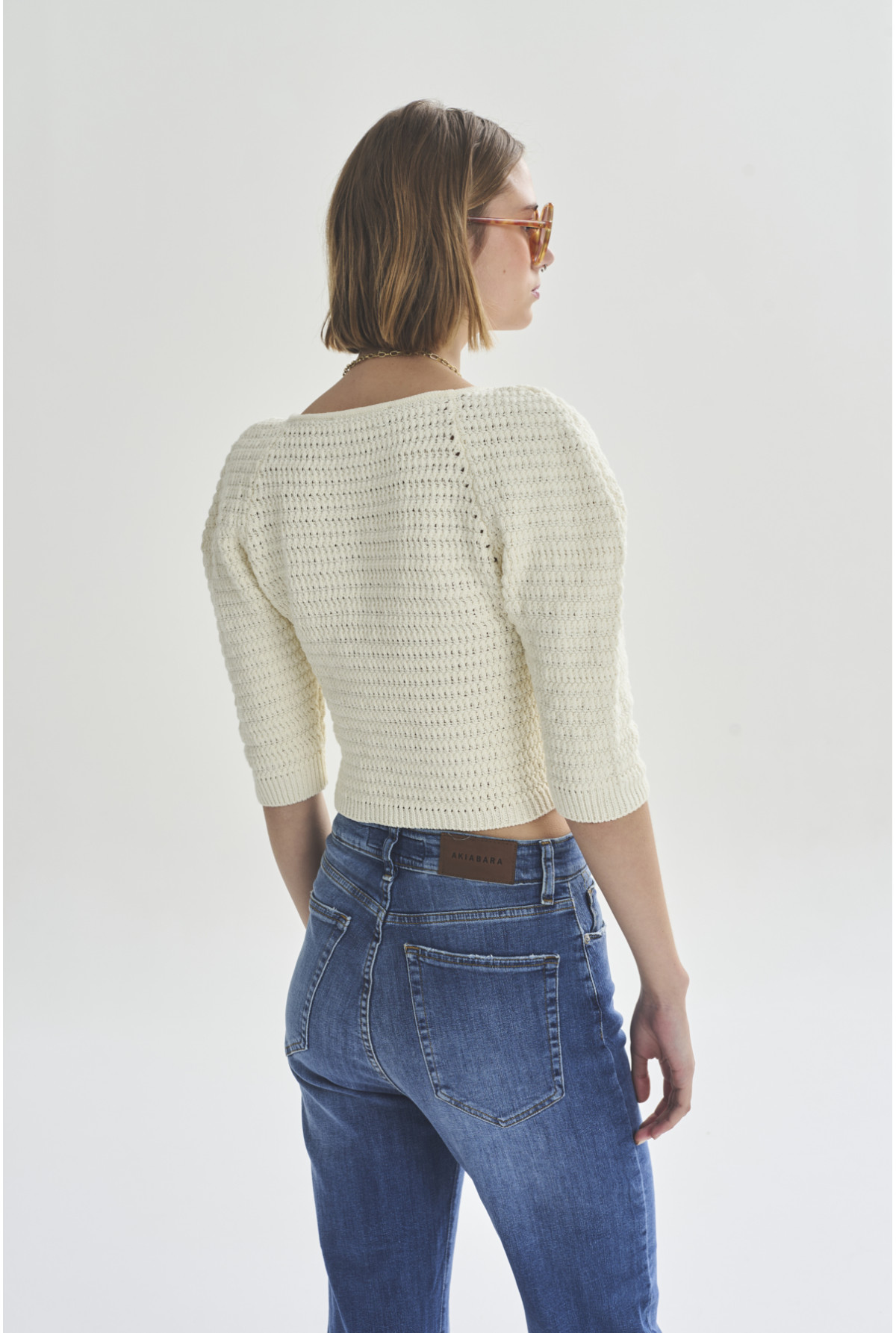 Sweater con cuello v, mangas al codo y con detalle de bra en delantero. Calce recto.