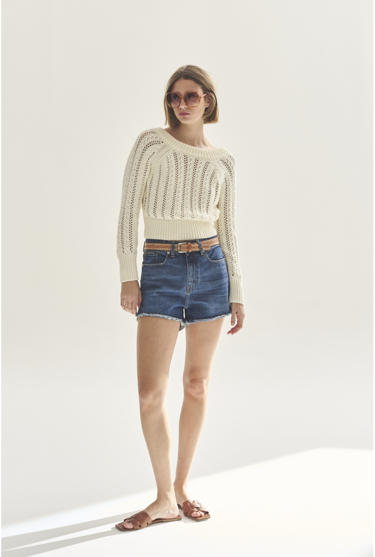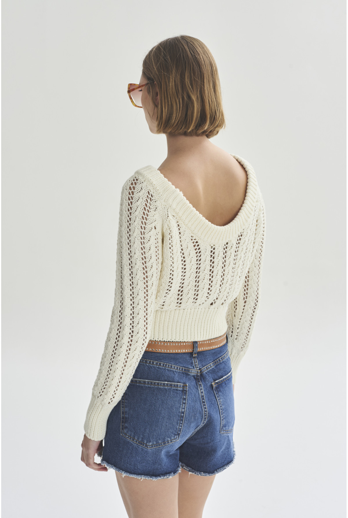 Swater manga larga con cuello redondo y cuello cavado en la espalda con tejido calada. Calce recto.