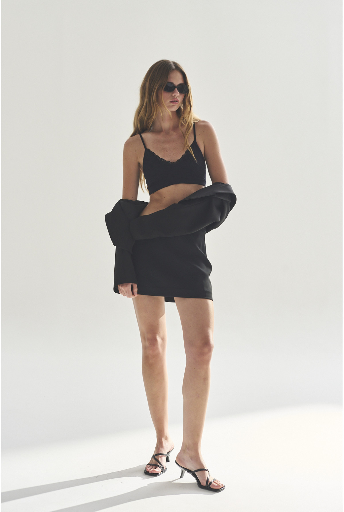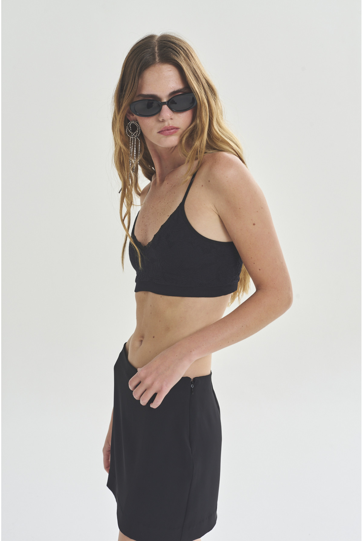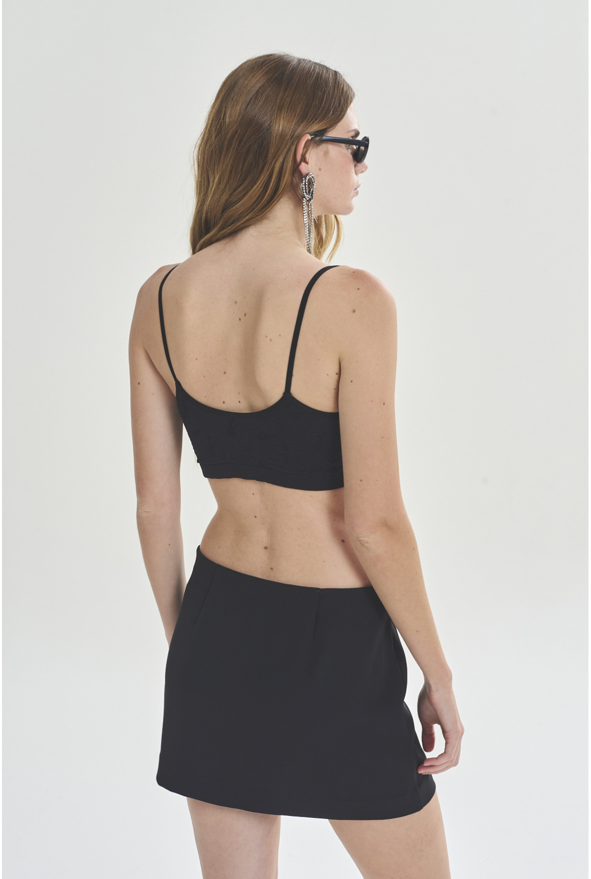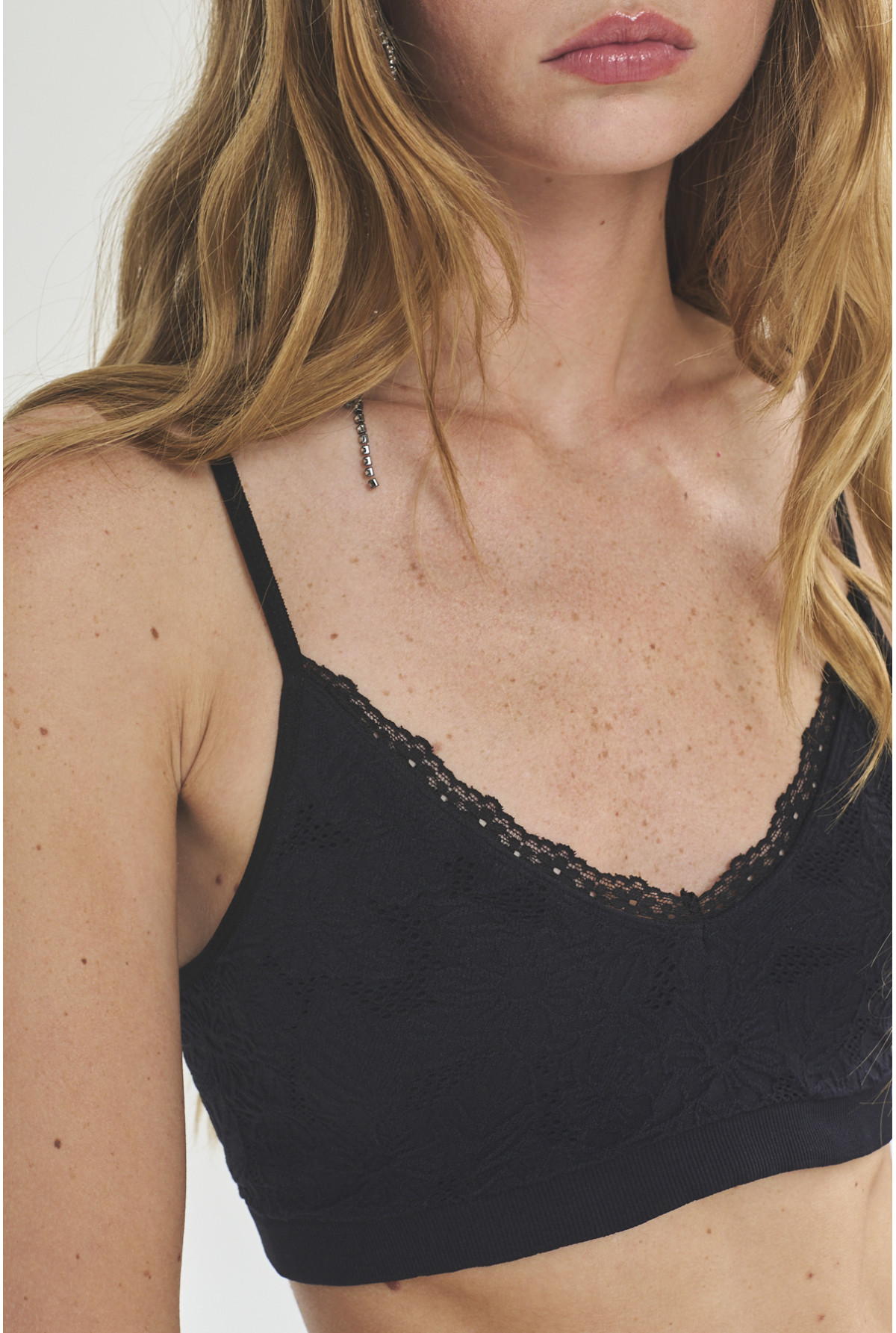 Top corto con breteles regulables, escote en V con terminación en puntilla, línea sin costura lateral. Confeccionado en jacquard de flores, con forrería. Calce Fit.