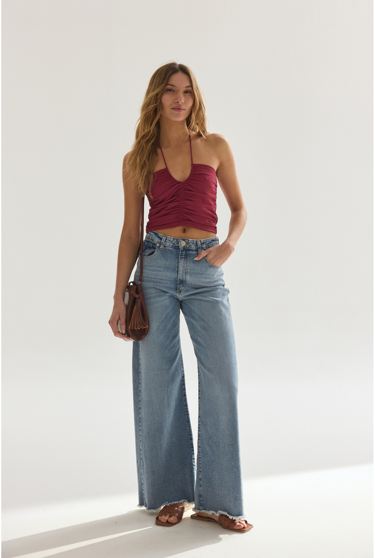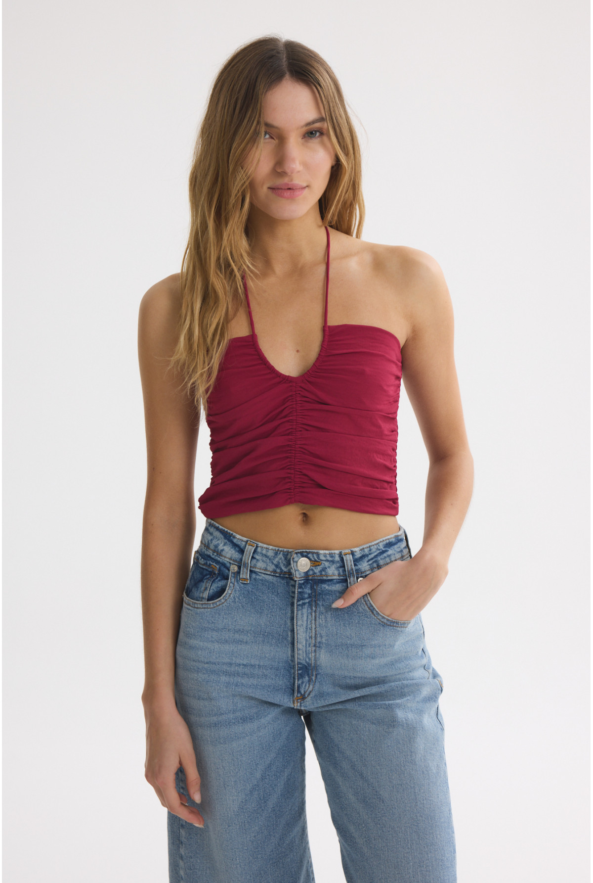 Top con doble capa de tela en delantero. Tiritas salen del escote delantero para ajustar detras del cuello. Espalda con punto smock.