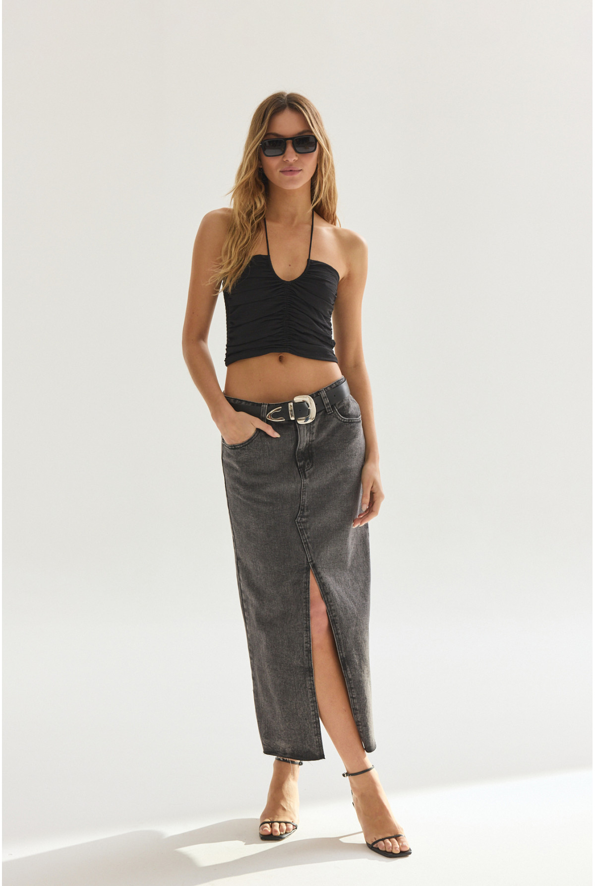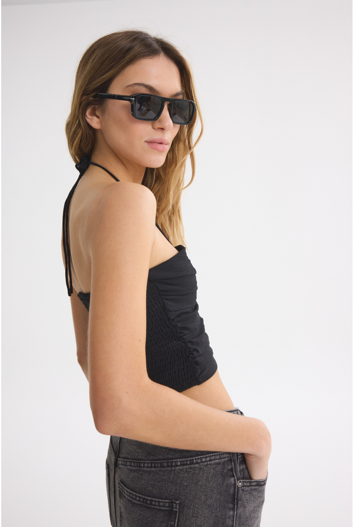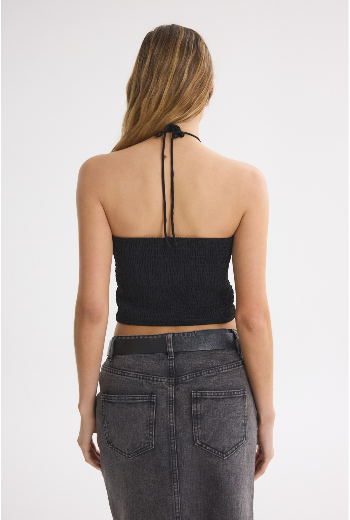 Top con doble capa de tela en delantero. Tiritas salen del escote delantero para ajustar detras del cuello. Espalda con punto smock.