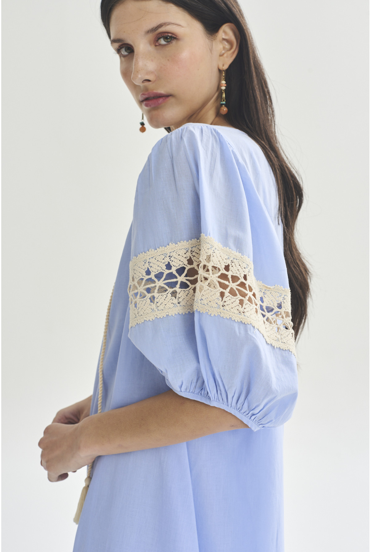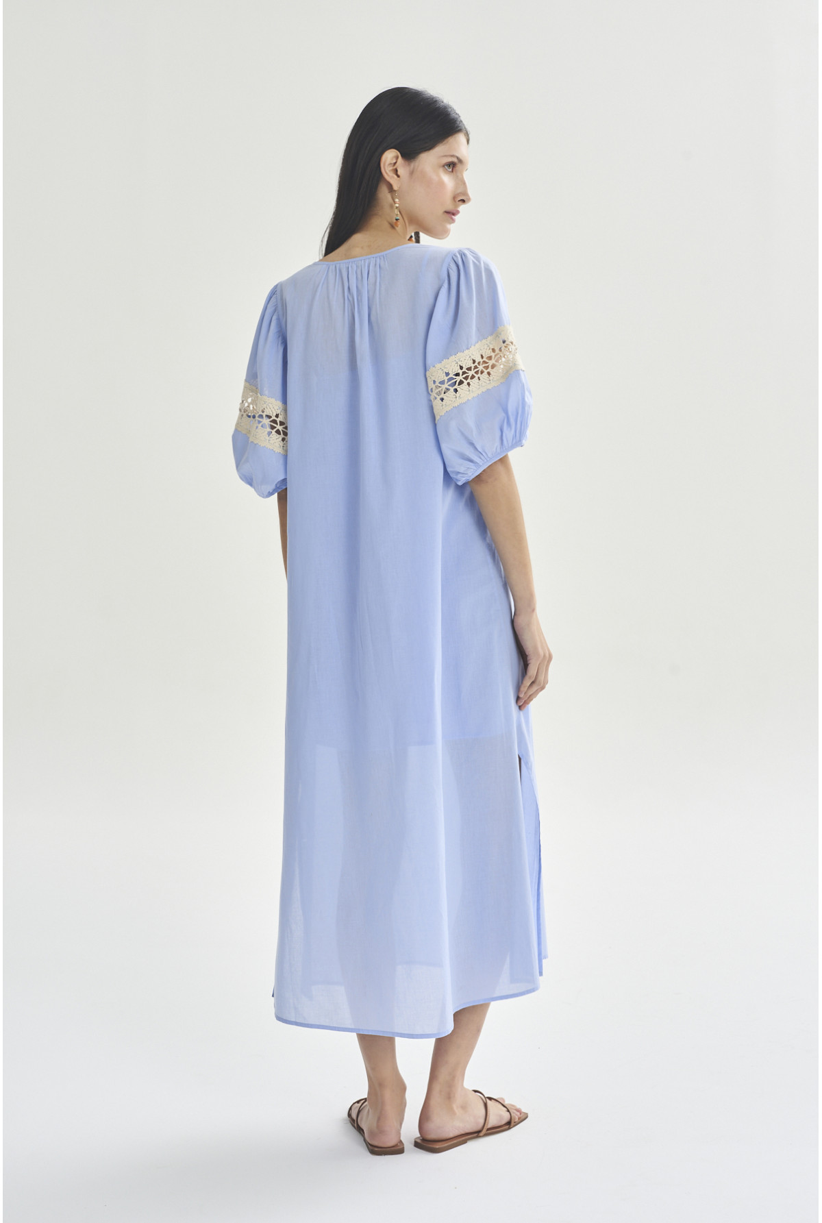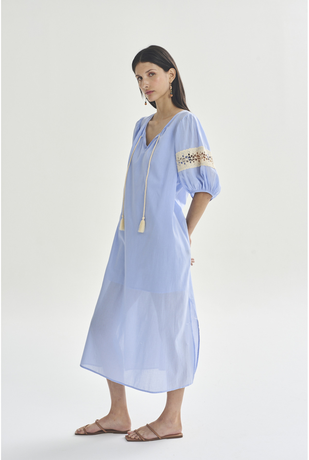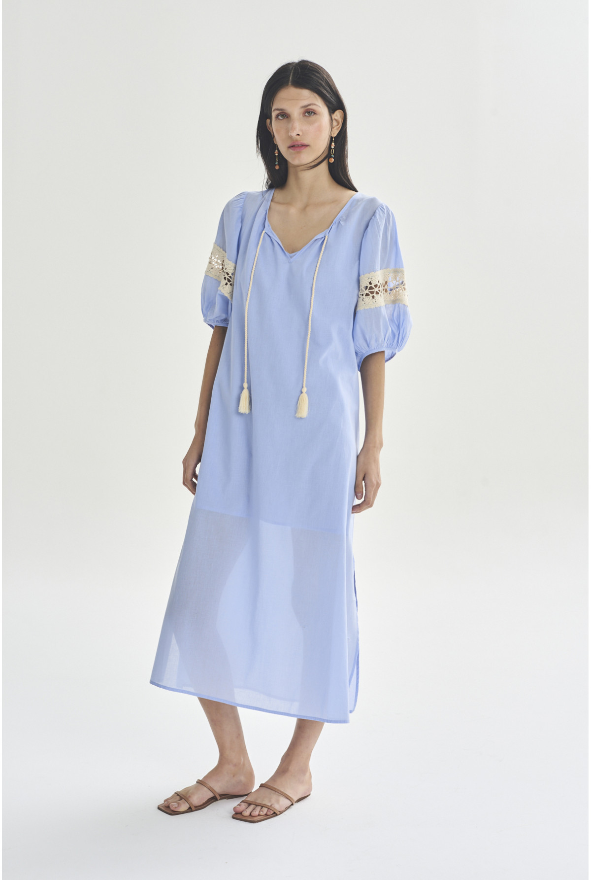 Vestido largo con mangas abuchonadas. Detalle de puntilla de algodón en mangas. Escote con frunces y abertura. Con lazo trenzado y fleco para atar en escote. Tiene viso.