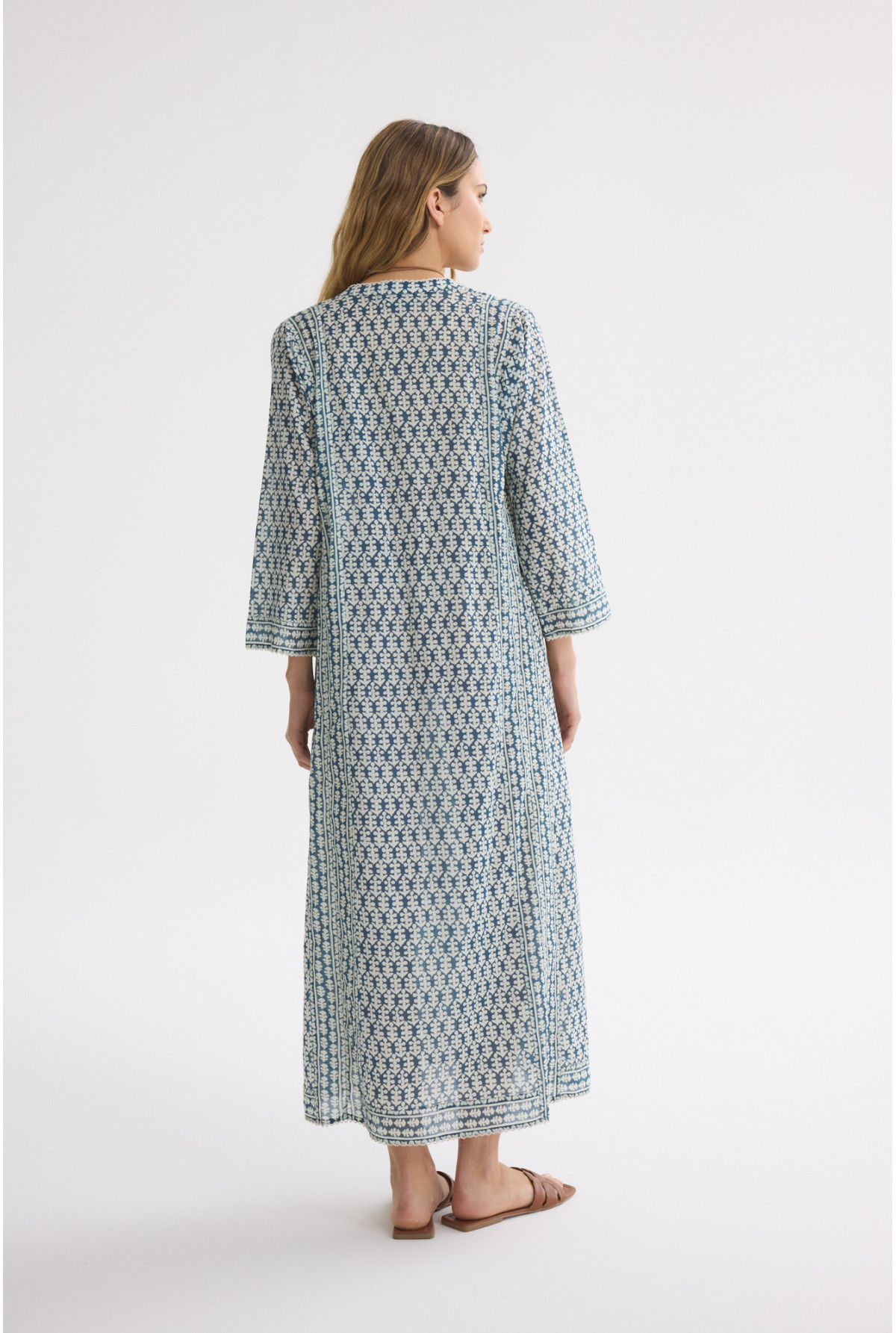 Vestido estampado manga larga. Cuello mao. Lazo desmontable en cintura. Detalles de bordado de crochet.
