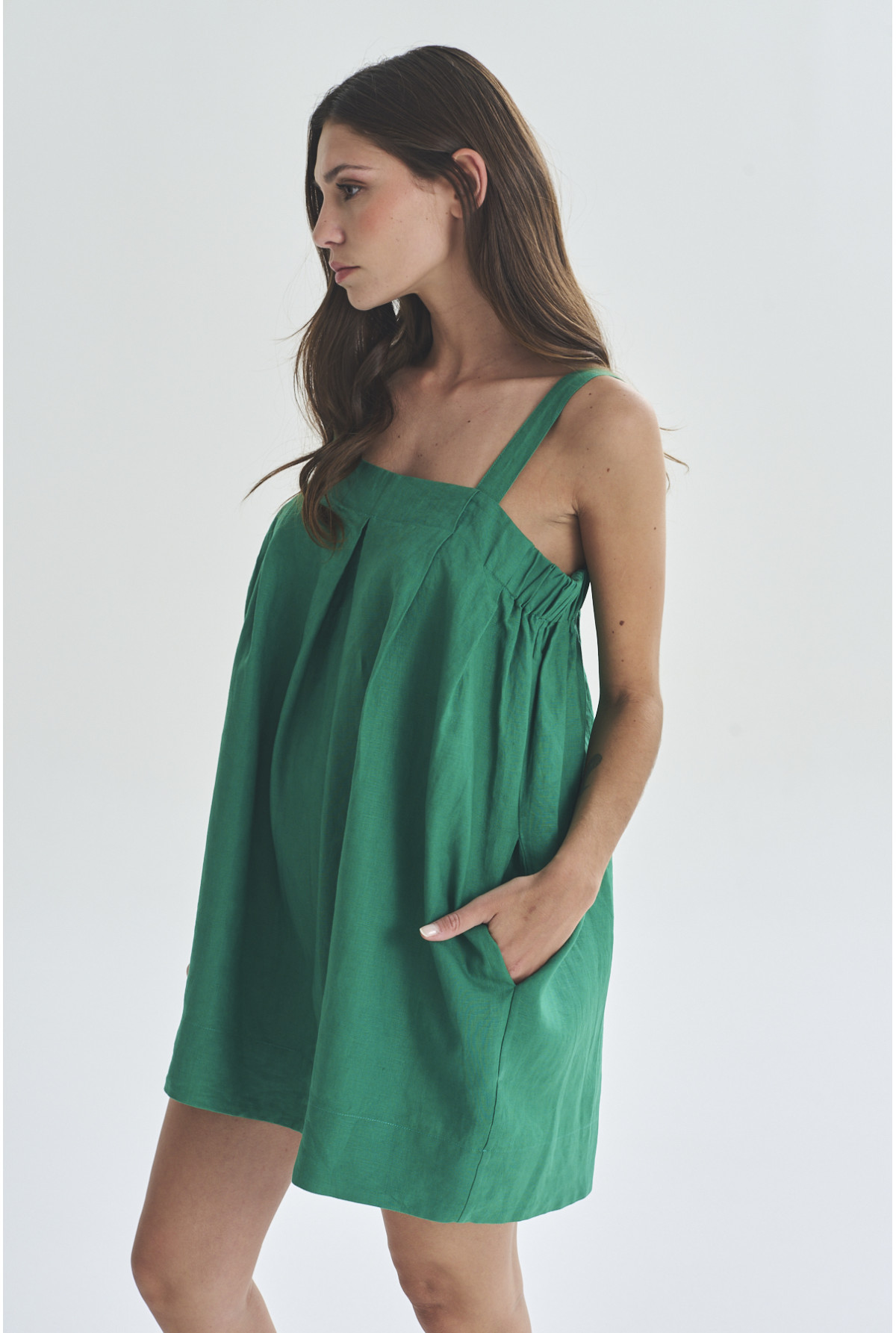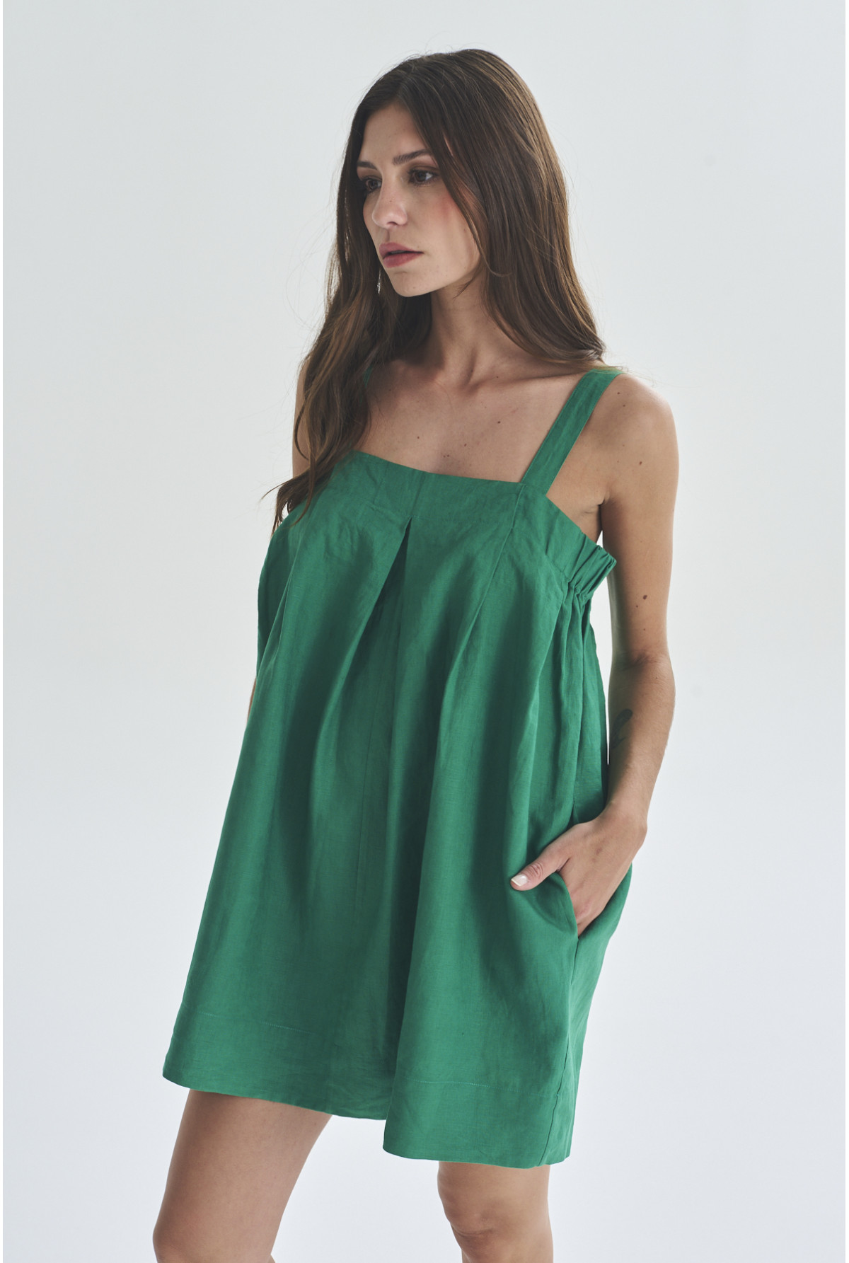 Vestido 100% lino corto con breteles.Bolsillos laterales.Elástico en escote.